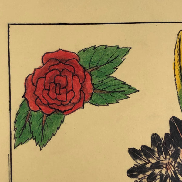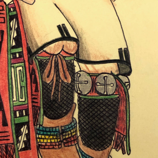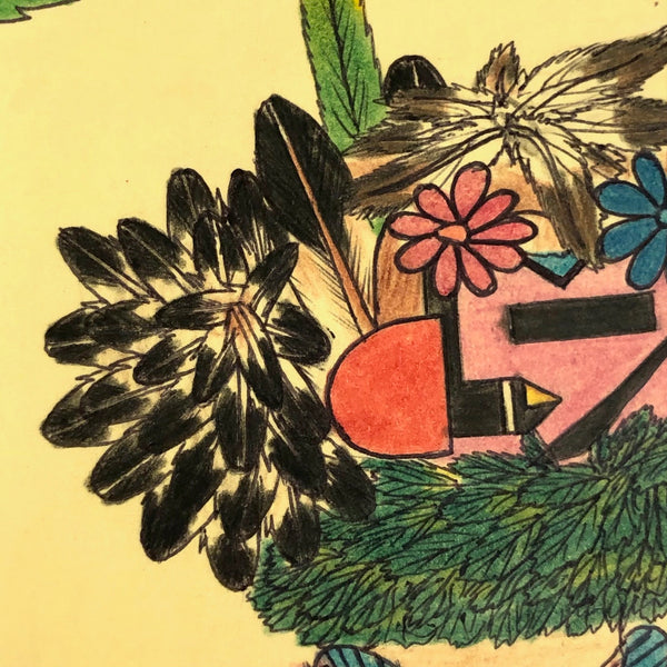 I purchased this drawing from a seller who had bought it along with a number of other pieces from the private collector of a teacher who had spent many years working on a Hopi reservation in Arizona, and believe it was made by a student of that teacher. I believe the figure represented in Tasap (Tasaf), the Hopi tribe’s representation of a Navajo god, beautifully detailed and decorated here in a manner that seems a hybrid of traditional and contemporary, including with flowers in addition to the feathers on the head, decorating the top corners as well. Really nicely done, in a combination of pen, pencil and colored pencil I believe, maybe some watercolor too.