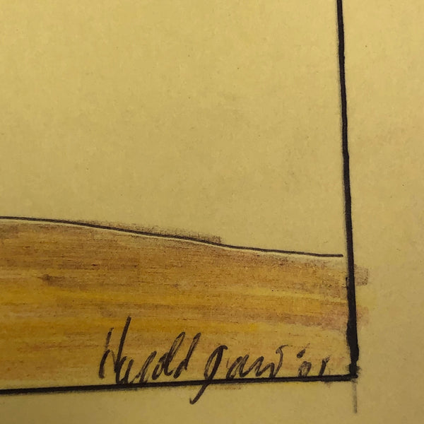 Signed at bottom right with what might read Harold Jaw (?) and I believe dated '01. 8 1/2" x 11" and in very good condition with a few small stains and smudges, minor, and a small fold at bottom right corner. Paper is bright yellow.