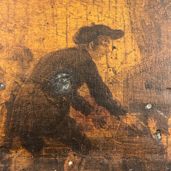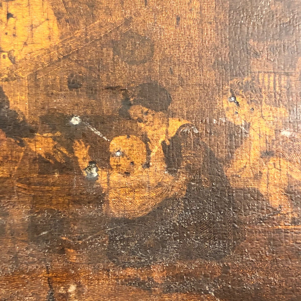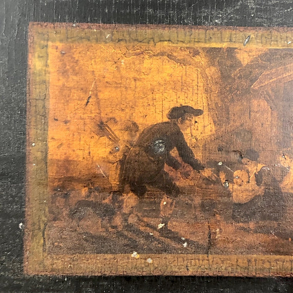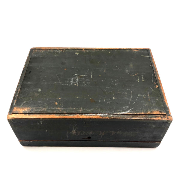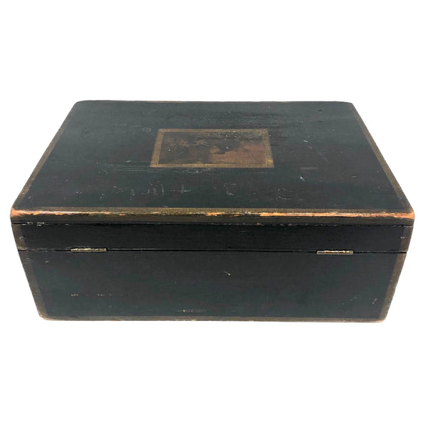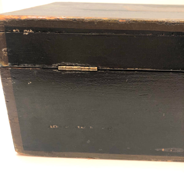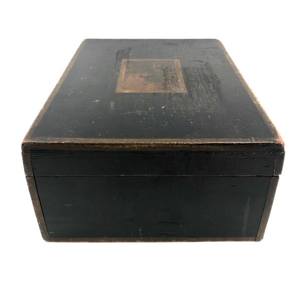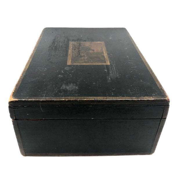 14" wide x 10" deep x 5 1/2" tall. The box is in great structural shape, with hinges firmly attached. The image at the center of the lid appears to be a lithograph over which stain was added. Wear and aging to the finish, some scratches, and various small dings, but charming still, and a great place to stash important papers or all sorts of things.