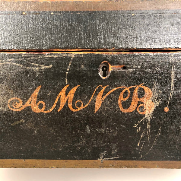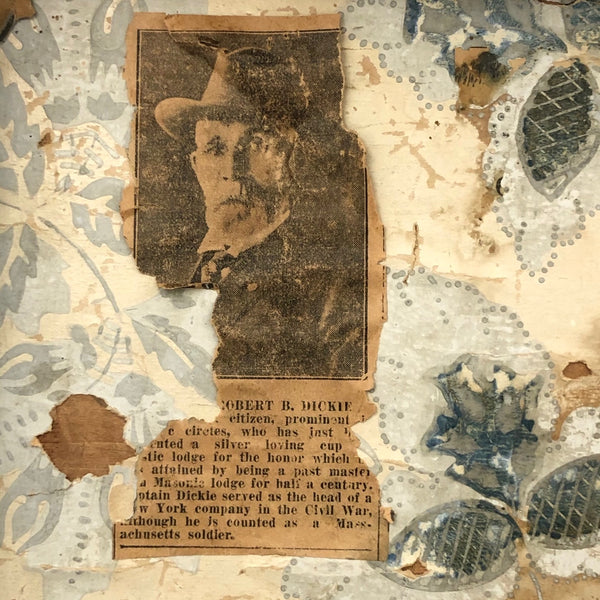 I'd love to know what all this old document box has held; I think it's had a pretty rich history. I love the ANMB monogram on the front, and the image of a family at the center of the top, with father and young child reaching for each other, and little dog nipping at his heels. But what really sold me was the wallpapered interior, with adhered newspaper clipping featuring a photo of captain Robert E. Dickie (a relative of the box owner I'd guess) who had headed a New York company during the Civil War, and had "just been presented a silver loving cup" in honor of his service as a Masonic lodge master for half a century.