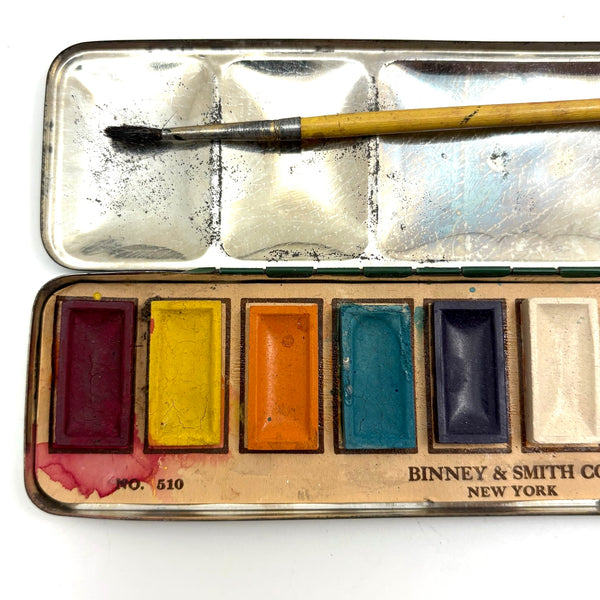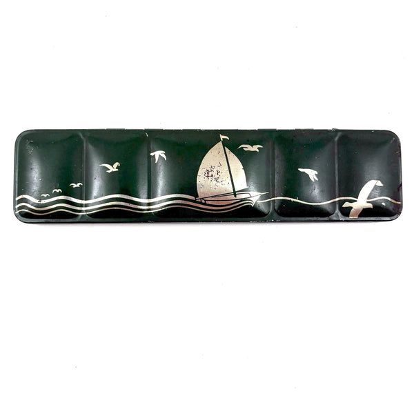 Of course I endlessly covet fine 19th century watercolor sets, but opening this c. 1950s watercolors tin this week, with barely used paint blocks, delivered the same sort of pleasure--the pure joy of color, crisply delivered! And a silver sailboat too. With paintbrush ready at the ready to put them to use, though I'd be pretty content to enjoy these in the near pristine state.