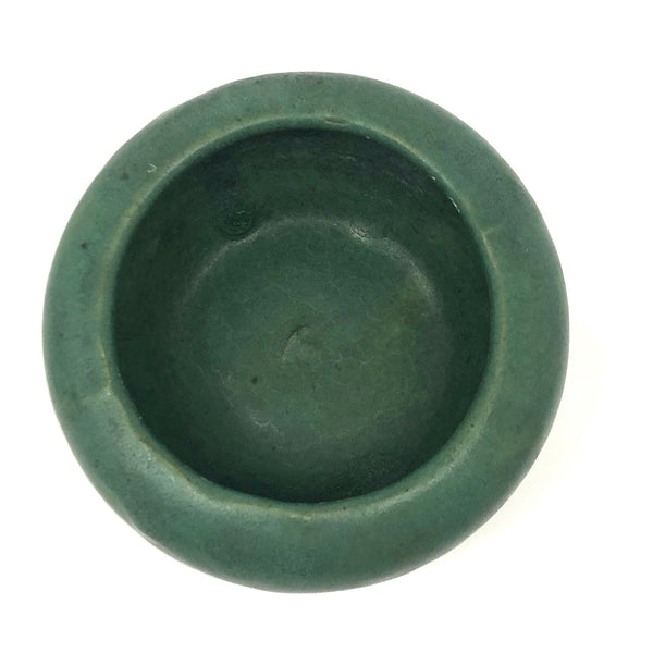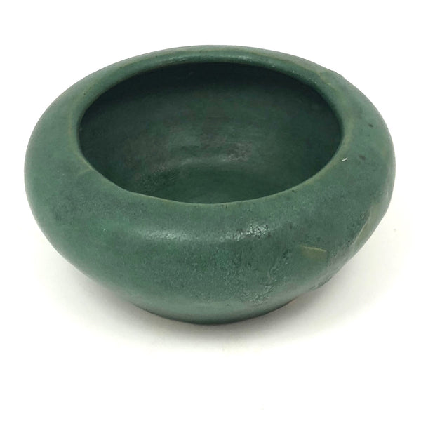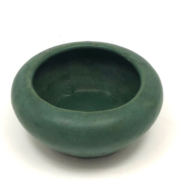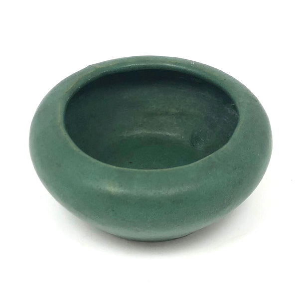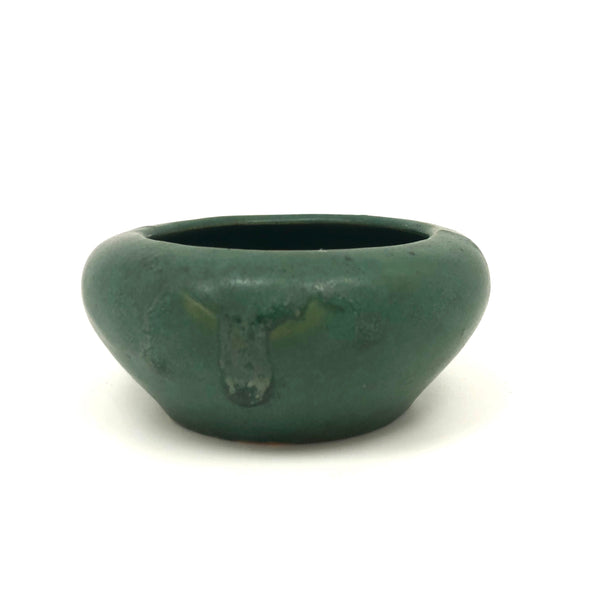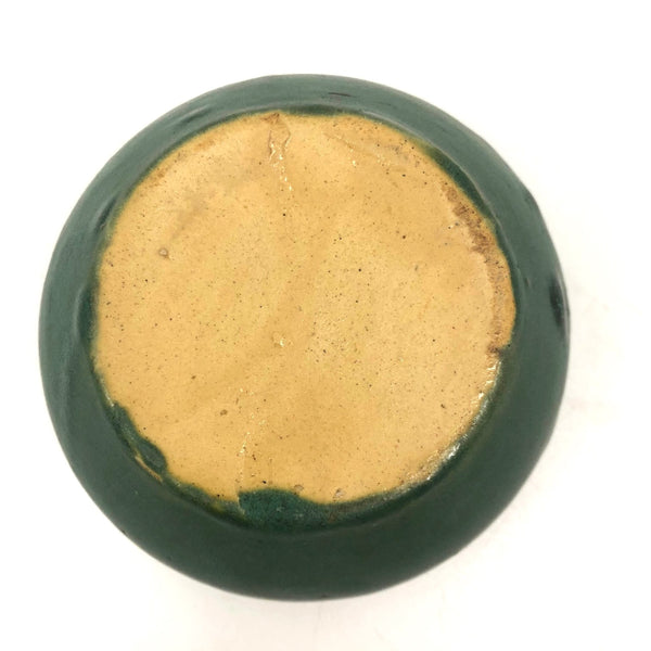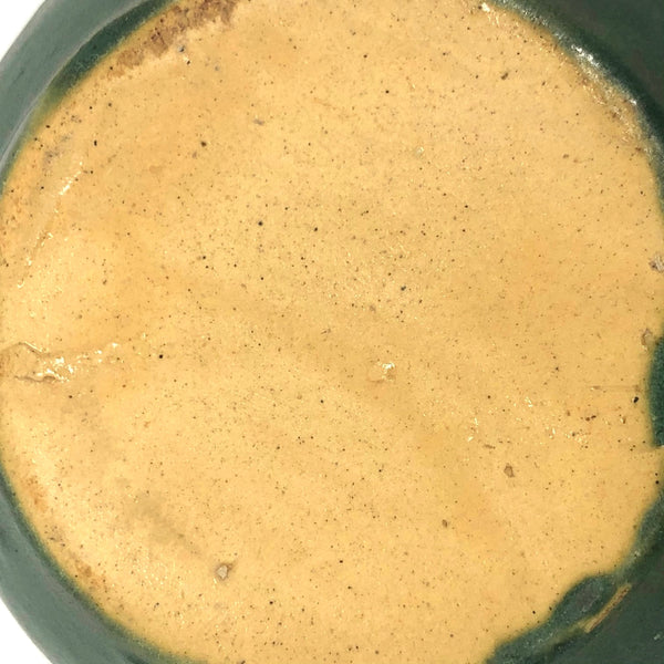 The latest product of my ongoing deep love for an Arts and Crafts matte green glaze, this is the smallest bowl or little planter I've found, with my favorite rounded form. With a yellow underside, I believe it is Zanesville, and would guess 1920s-30s. There is a big fat glaze drip on one side, just the sort of irregularity that adds to my love of these sorts of pieces.