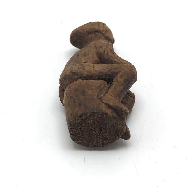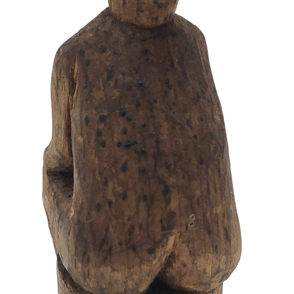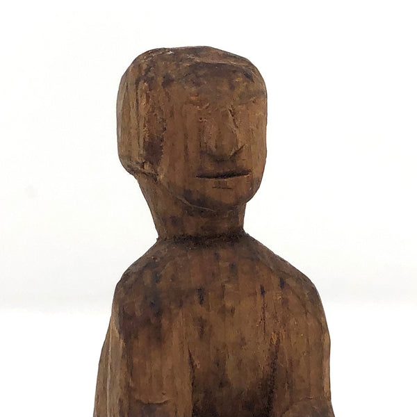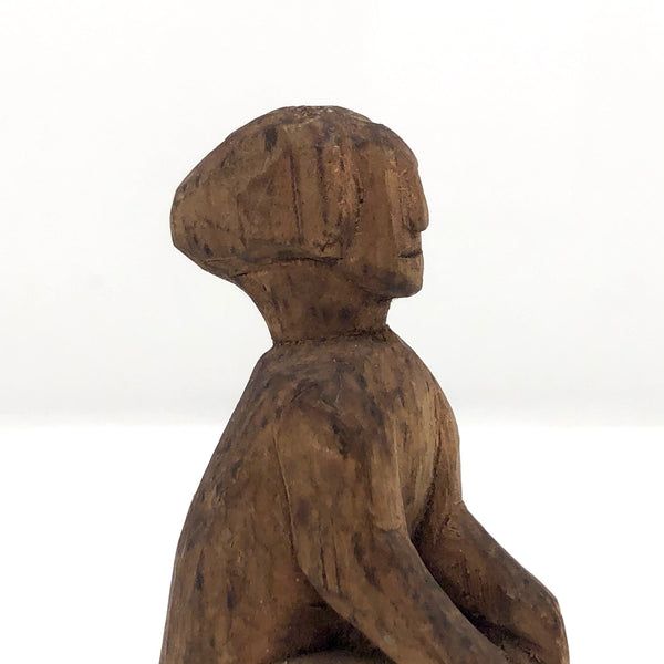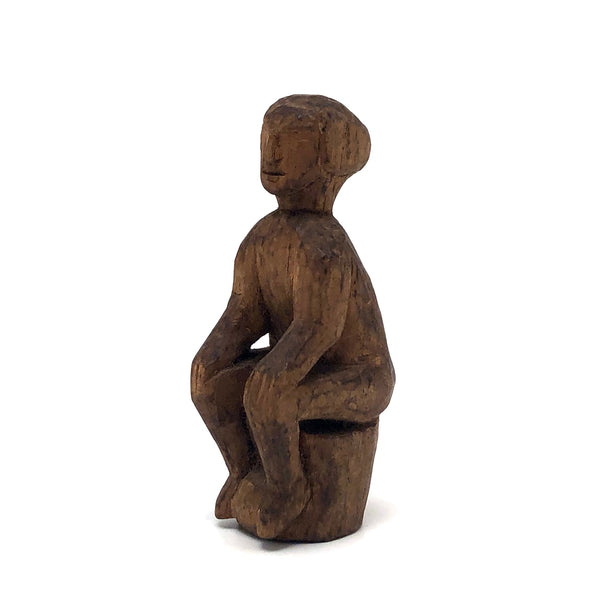 Not even 3 inches tall, but a lot of expression packed into this wonderful little carved figure, who might be contemplating the meaning of life, or maybe just waiting patiently for someone else to arrive. The deep shape of the head suggests either a big brain or a hair bun (maybe both!), and then this great posture, with detailed fingers resting on bent knees. Carved of pine I believe, with a wonderful patina and a big presence.