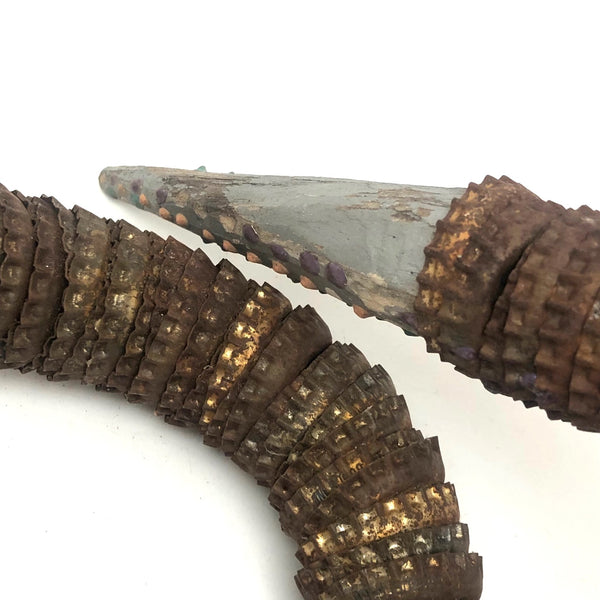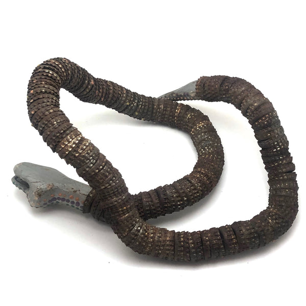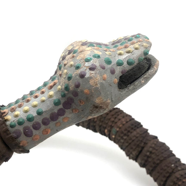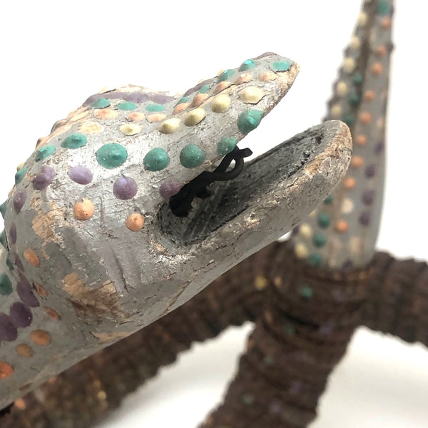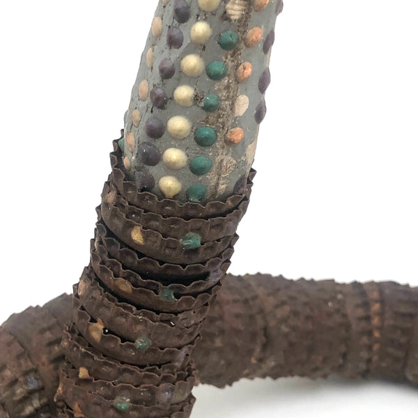 How could I resist this rattler, purchased this week from the case of one of my favorite dealers at an antiques shop in New Hampshire? Bottle cap rattle snakes were a thing, but much rarer to find one with a carved wood head and tail and painted in silver with polka dots! Great from every angle, fun to position, and so many contexts he would enliven. With the perfectly rusted bottle caps strung on wire, which comes out the mouth as its tongue.