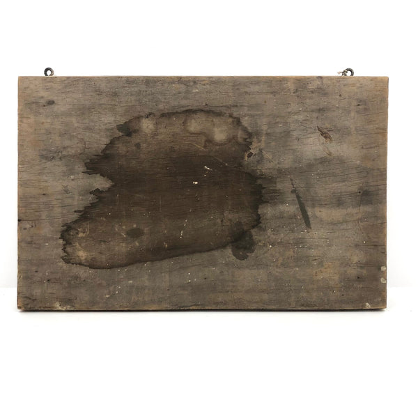 14" x 9" x 11/16" with two eye hooks along the top for hanging.