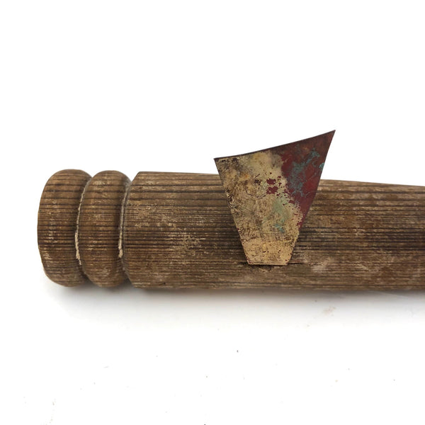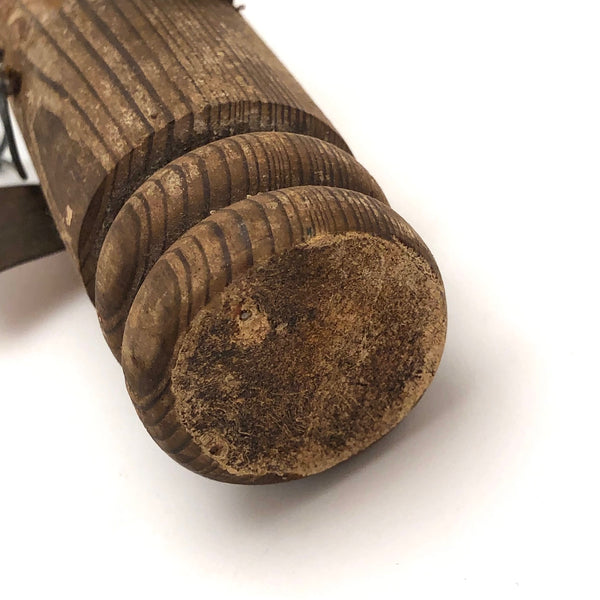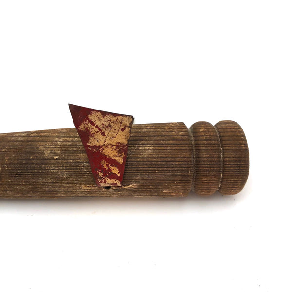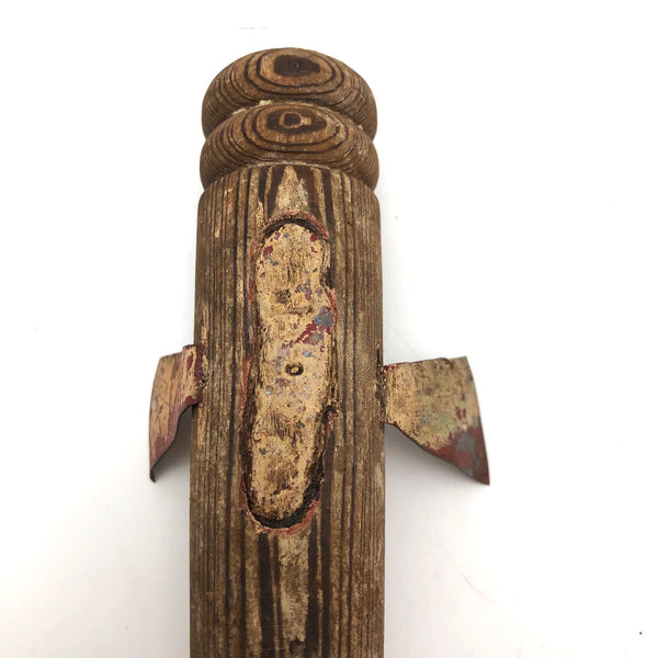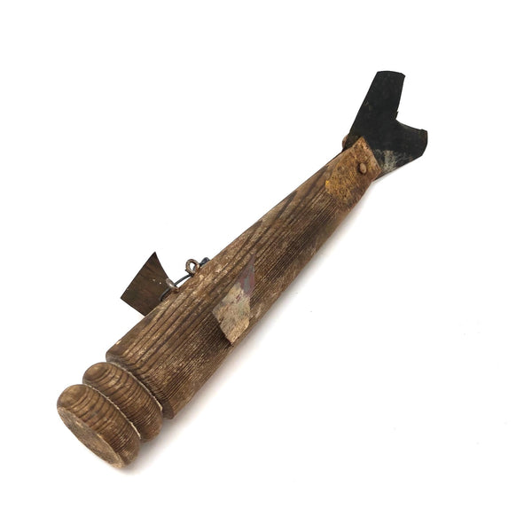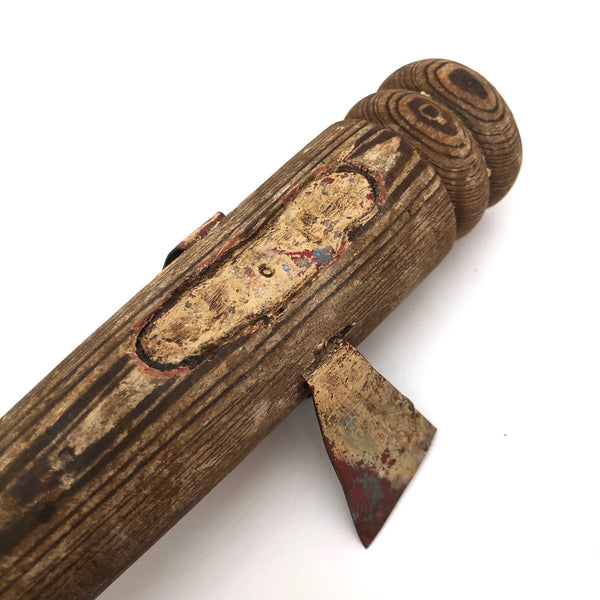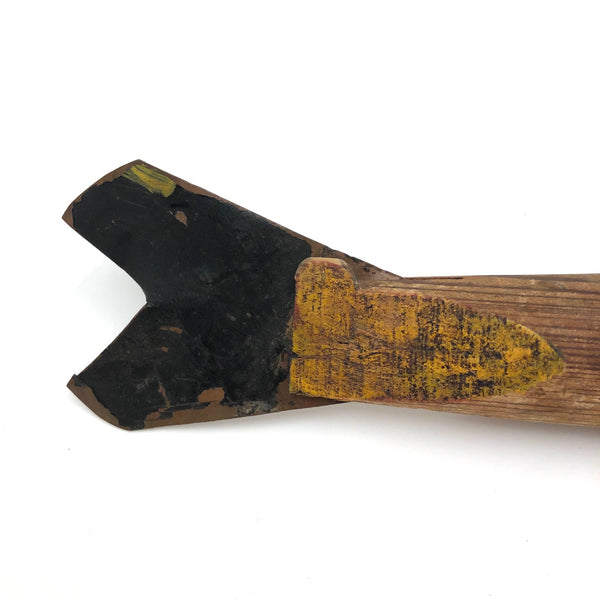 I love an old folk art ice fishing decoy and even better a decidedly make do one--and this one especially for distilling down to its essence what an ice fishing decoy wants to be. Two pieces of cut tin for the front fins, one more for the tail, with just enough painted color to impart it with the powers of seduction! Plus a lead weight on the underside to allow it to sink. I believe the body was a post of some kind, whittled to taper at the tail end, hence making me think of this as the bedpost doll of ice fishing lures.