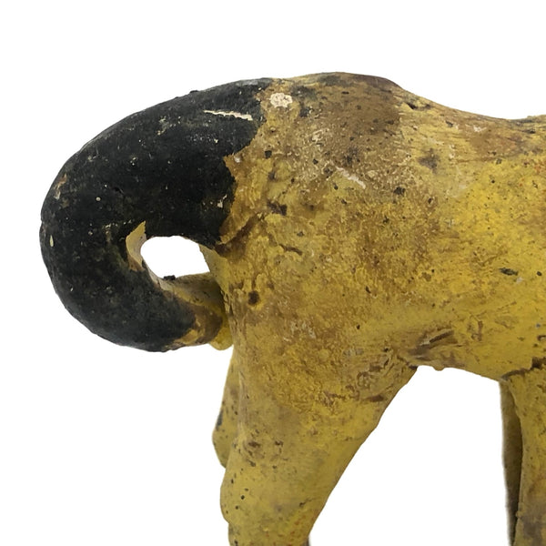 A total charmer, and older Mexican folk clay animals in this manner are quite hard to come by. With its long legs and tall ears, I take this creature for a coyote. Wonderful face, wonderful tail, wonderful yellow, and with quite a patina that makes it seem that it may have been incorporated into an alter, accruing some of the soot. Terrific.