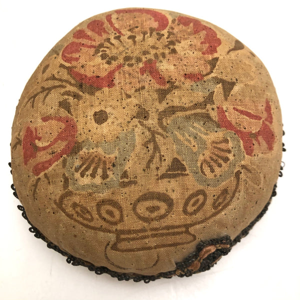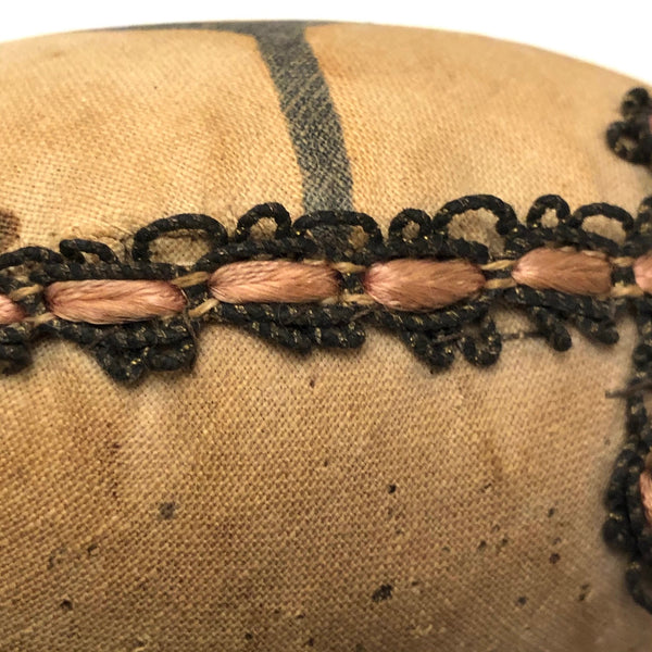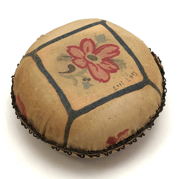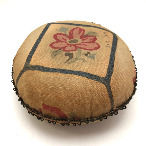 Honestly, it is the handwritten "Get Hot" on one side of this old pin cushion that sold me on it; not quite sure the story, but happily provocative. It's a pretty good pin cushion too, fancy trim around the perimeter, and very tightly packed with what I'd guess is sawdust, making it quite solid. One side was heavily used, with pin pricks all over, but the other, with the single flower, not much at all.
