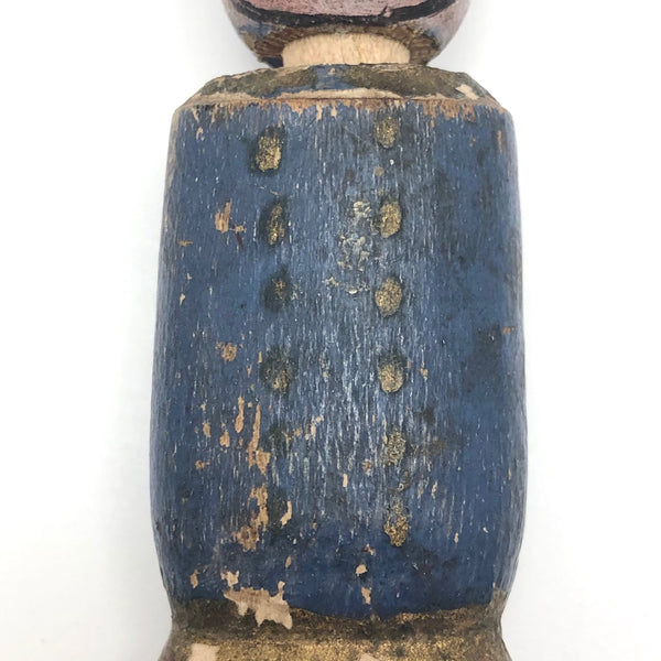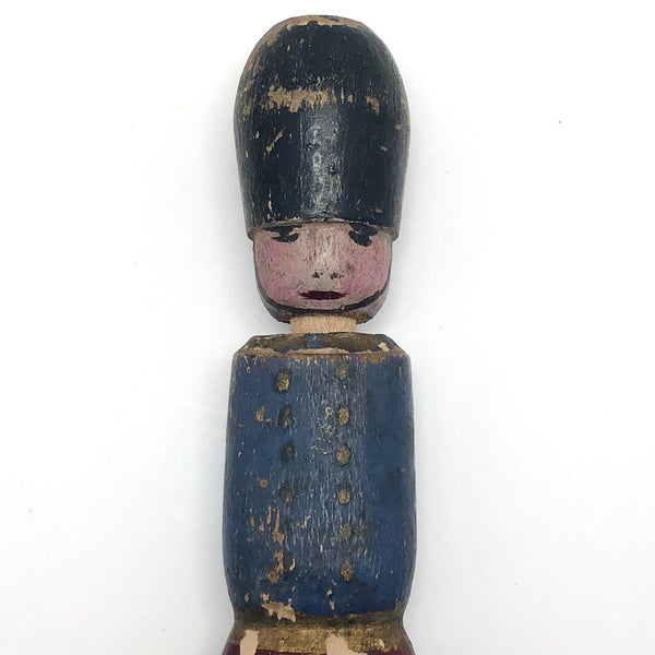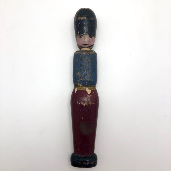 Just a sweet old wooden soldier pin, who I assume once had eight comrades as part of a nine pin set. I really have a hard time passing these old hand-painted pins by, and especially love the face on this one, with two tiny dots for a nose, and eyes just barely peeking out from underneath that tall hat! Plus those gold buttons against blue coat.
