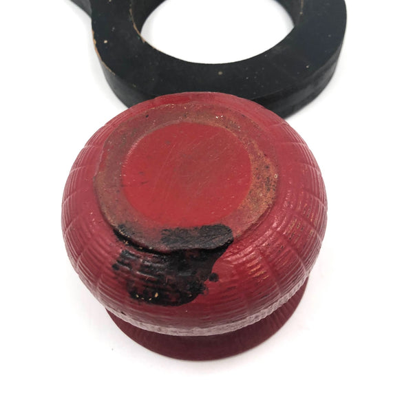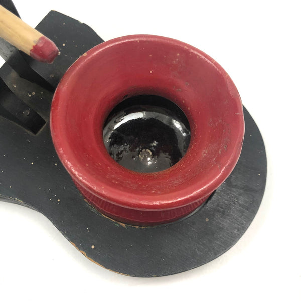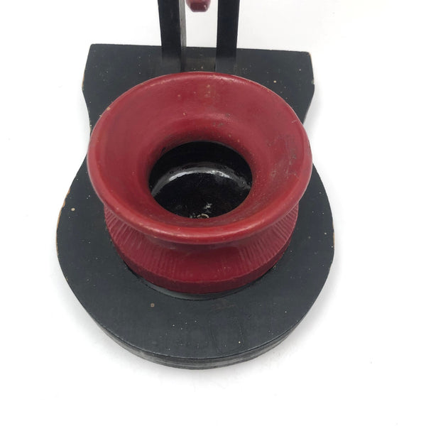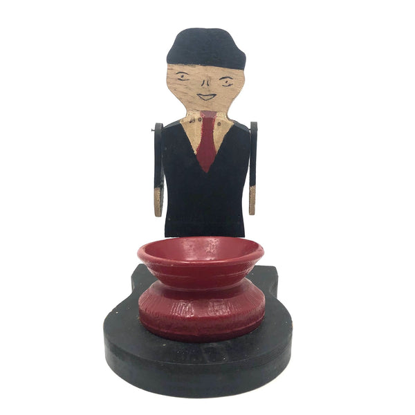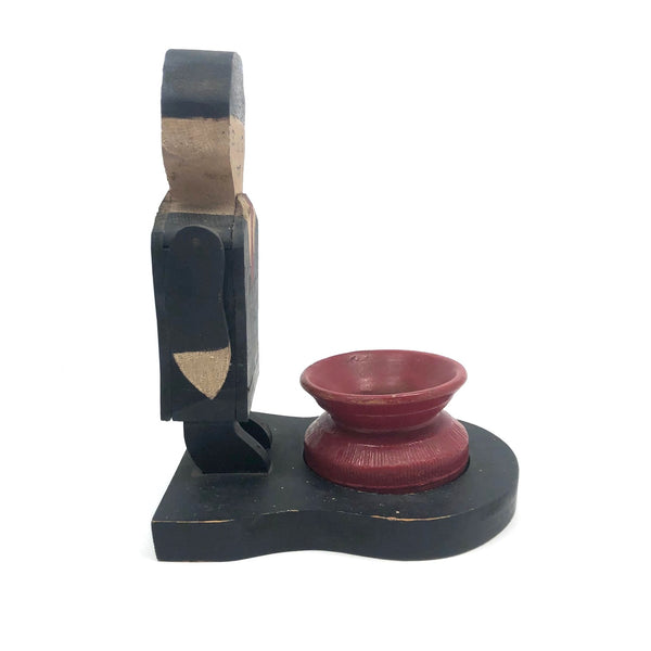 I've bought and sold a few old folk art naughty men of various sorts, who expose themselves when their bodies are lifted, but this is the first I've seen with a vessel incorporated, which is what especially sold me on it. I think it would make the perfect little vase or planter (a little cactus would seem most appropriate!), which he could proverbially water when lifted. Or if one were really handy, perhaps it could be turned into some sort of fountain!