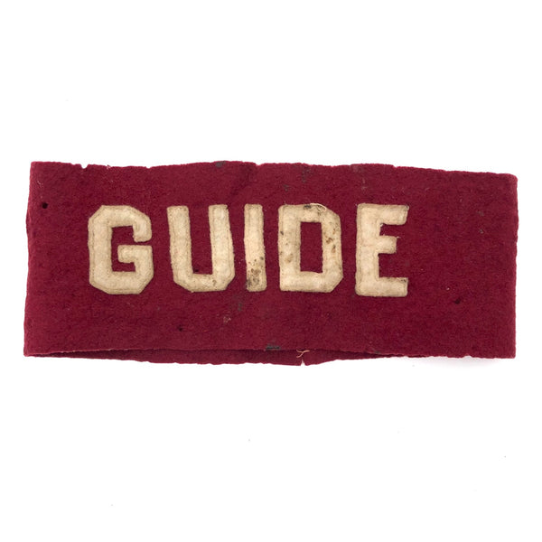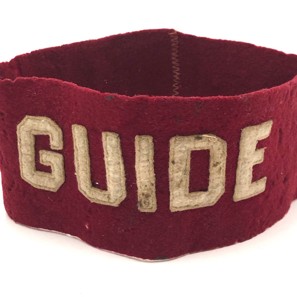 I can't find a likeness of this one so am not sure if it was worn by someone in the military or the scouts or a tour guide at Harvard or what, but I really love those white letters against rich red felted wool, and who doesn't either want to be, or need, a GUIDE (or both!)