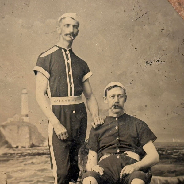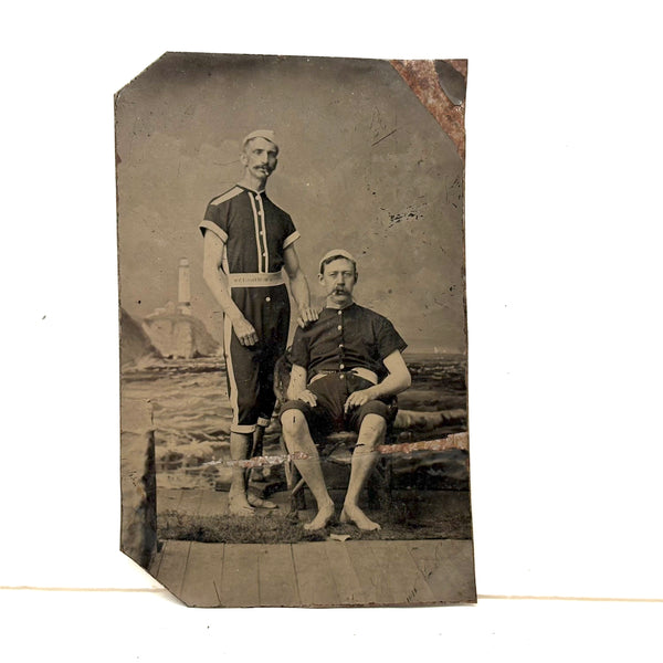 I find it hard to resist bathing beauties of all varieties, and these two certainly make quite a pair! A bit of a Mutt and Jeff sort of combo, both with quite the mustaches and cigars hanging out of their mouths. With a lighthouse in the distance on the painted backdrop. A fun one.