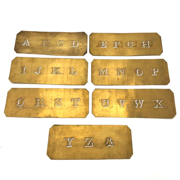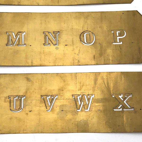 Each stencil measures 6" l x 2 3/8" t. Very good, used condition. The EFGH stencil shows an echo of the ABCD--it could probably be polished away, but I like it as it is. Early 20th c.