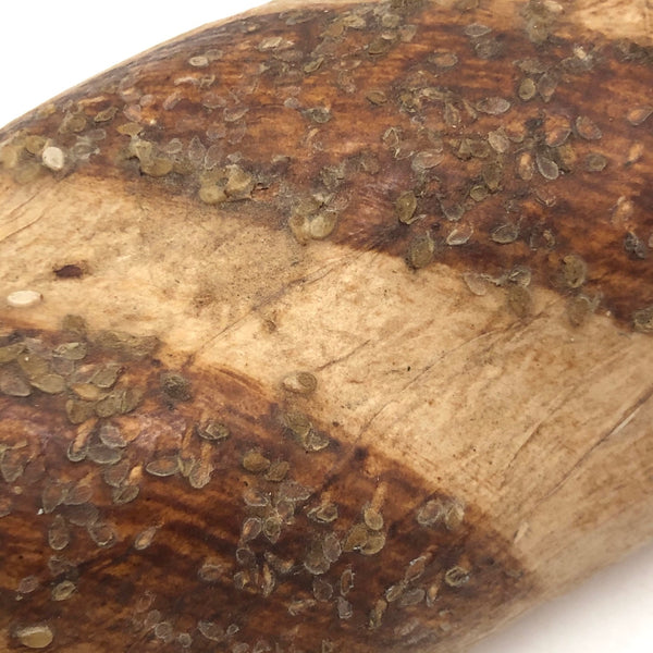 I suppose my recent obsession with stone fruit, combined with a love for all things troupe l'oeil, made my snatching up this fake loaf of bread an inevitability! Really a pretty great object though, and certainly as much a labor of love as baking a real loaf! Very realistic looking, painted papier mache I believe, with a scattered of what look very much like sesame seeds along the darker brown stripes. Very fun.