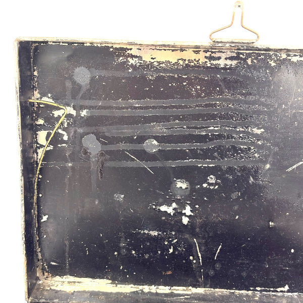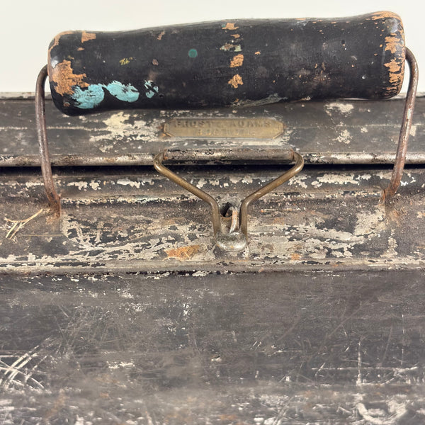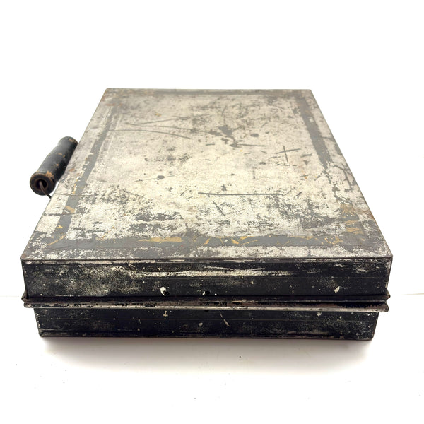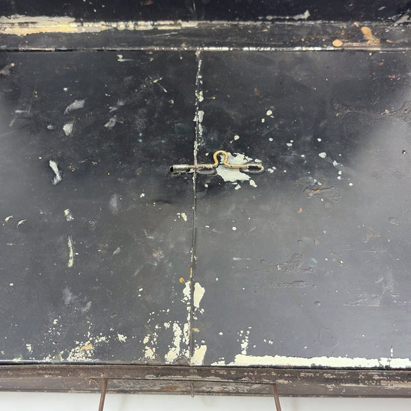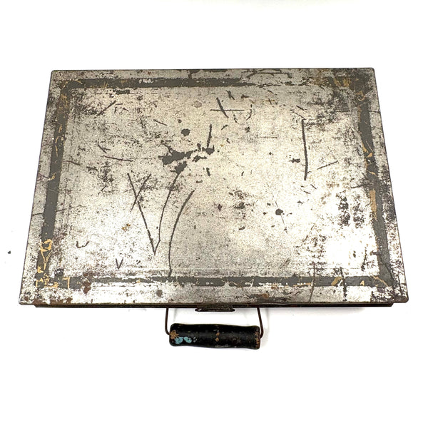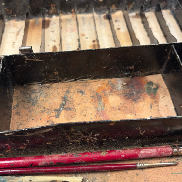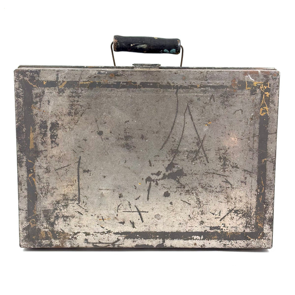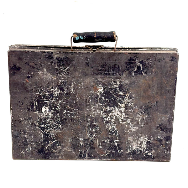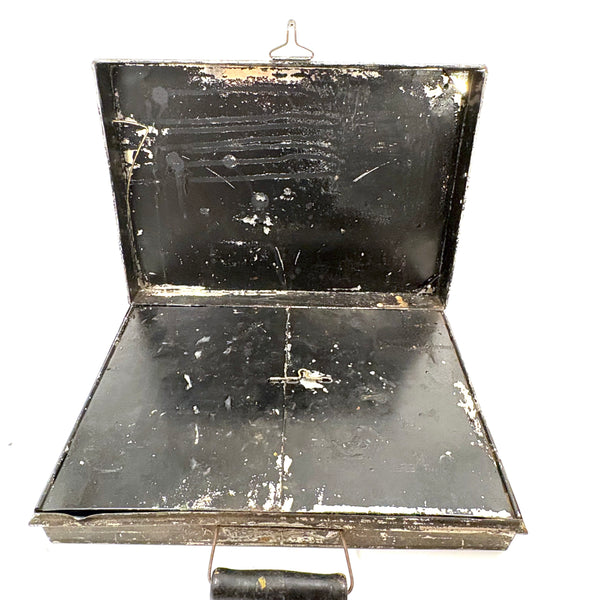 13 1/4" x 9 1/2" x 2 3/4". Much used and worn. Tin exterior once painted black now shows mostly silver. Interior shows plenty of grime. But it closes and opens up as it should, with the interior "doors" that close over paint compartments latching tight, and the lift out tray still in place.