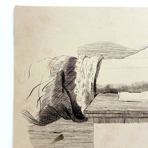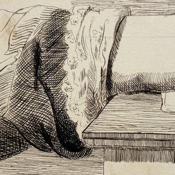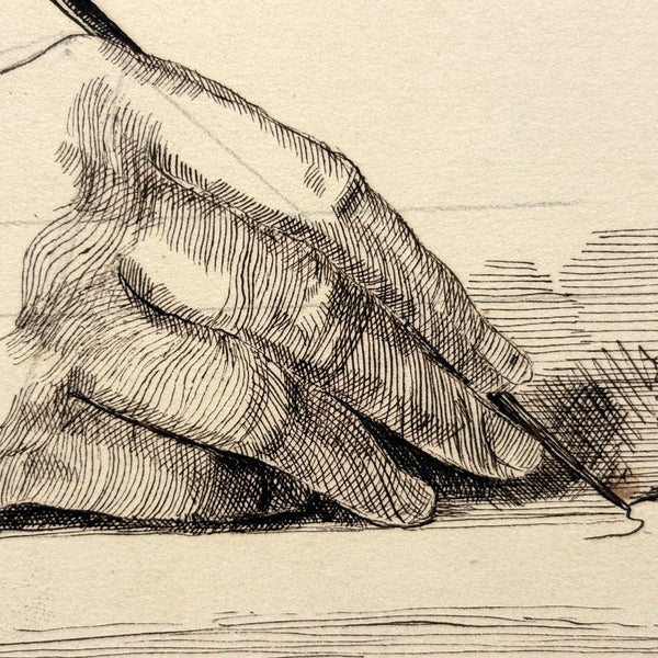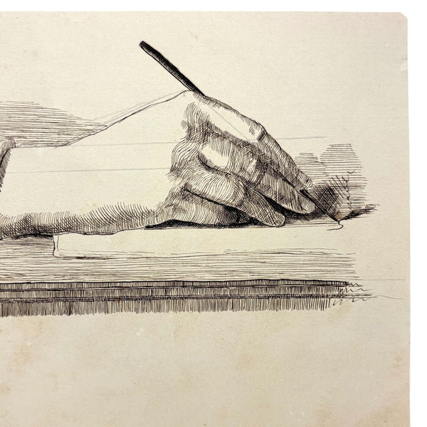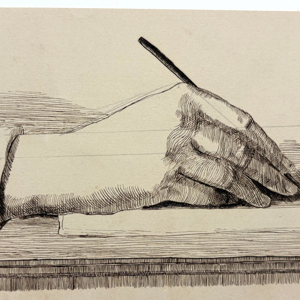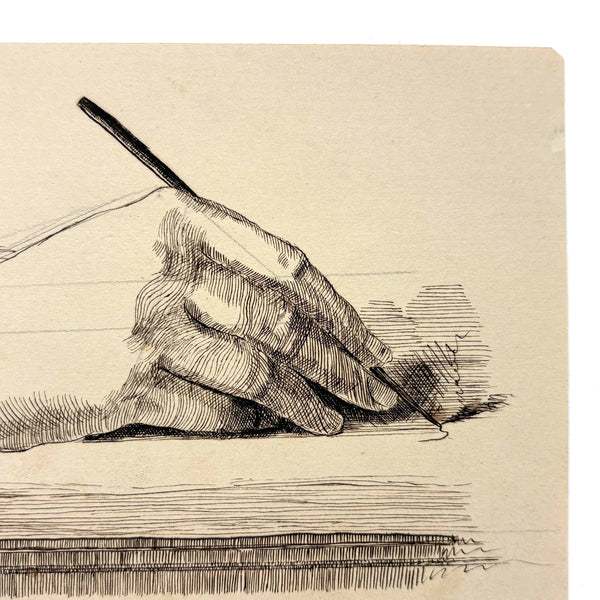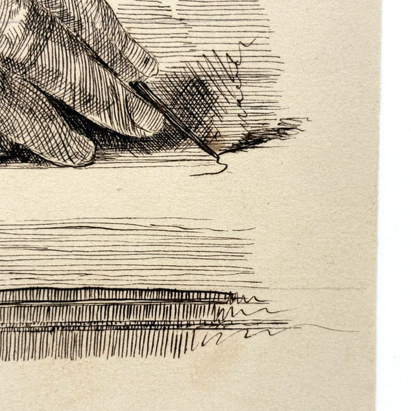 Just a beauty of an ink (pen and ink) drawing, custom made for hanging over a writer's desk! Late 19th century I believe, perfectly executed, feeling all about the power and potential of the pen, and self-reflexive/self-referential too.