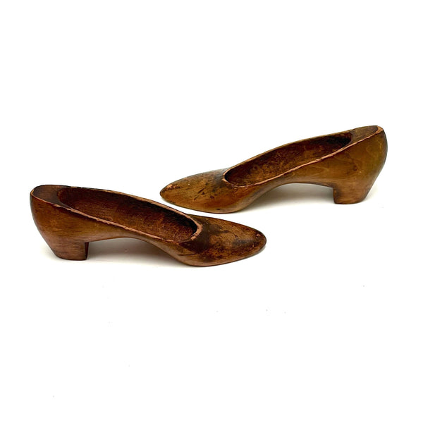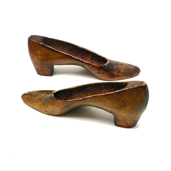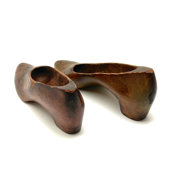 Photos don't really capture the beauty of these carved shoes, and they make the wood, pine I believe, look a bit darker in spots than it is--but so it is. (Trust me, they're great!) And for me it is very much about the two shoes as a pair, feeling like narrative-full stand ins for an absent woman (who left them behind and is out wearing flats!) Sometimes carved miniature shoes like these were carved to house pin cushions, but there is no evidence here of that, and they feel perfectly complete as they are. With the undersides showing some difference in the color of the stains it seems, though I wouldn't have discerned a difference otherwise.