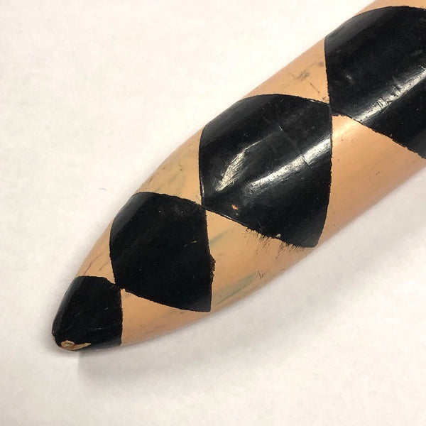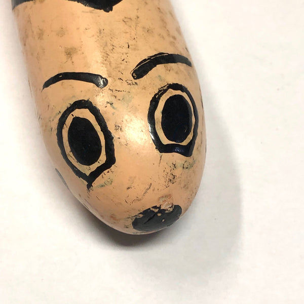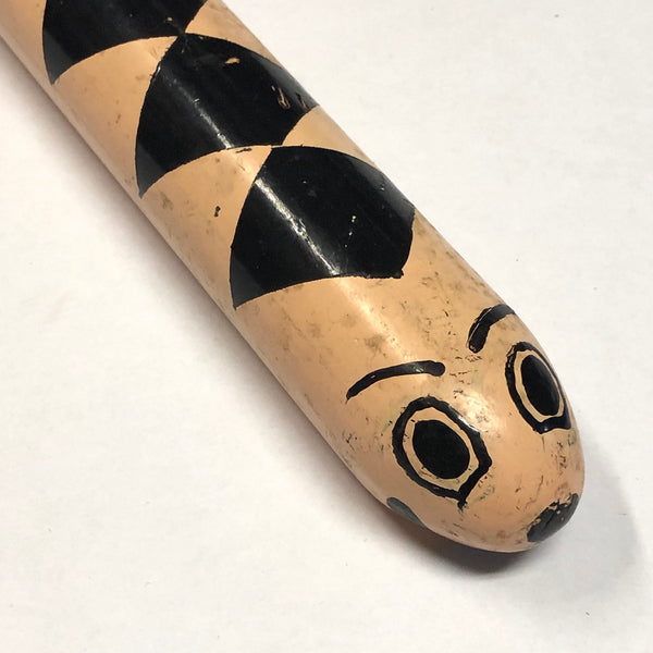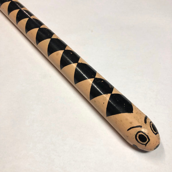 One could use this snake to play stickball, or to smash a piñata, or to hold down a pile of papers on a windy day. I think its pretty great, painted bubblegum pink with these black diamonds all down its back, and then a funny little face, complete with eyebrows at the rounded end. Pretty fun.
