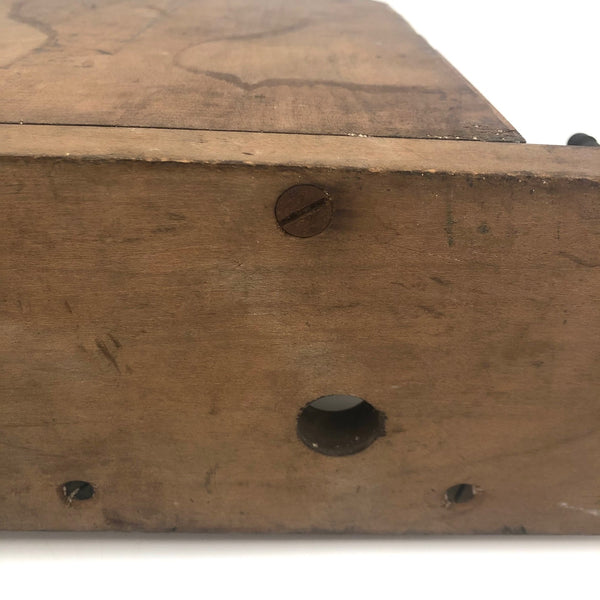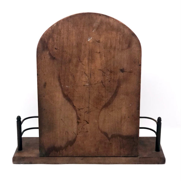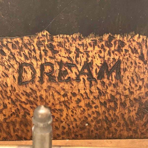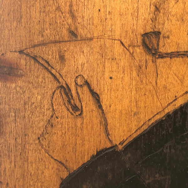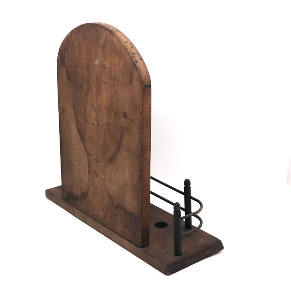 I couldn't resist the pyrographed "Pipe Dream" back panel of this old wood and brass pipe rack, which if not for hanging pipes would make a fine rack for a few small plants or, of course, for a handful of carved heads or things, perhaps especially rather forlorn ones. The panel is also easily unscrewed from the the rack and could just itself be hung on the wall, perhaps near one's favorite reading chair. I especially love the swirl of smoke billowing up from the pipe of this bearded fellow, which rather matches the swirls of his hair.