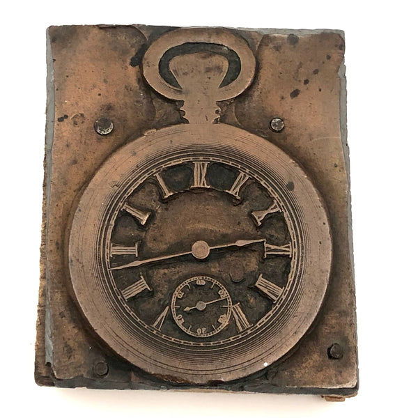 Pocket Watch at 2:43, Antique Copper Print Block on Wood