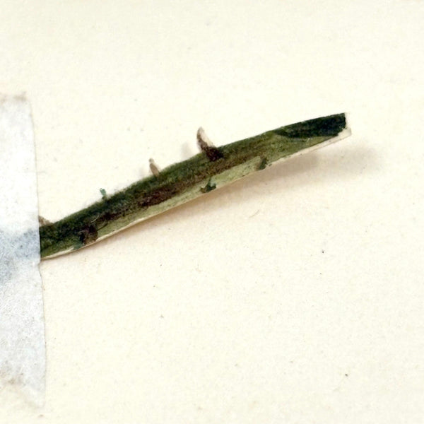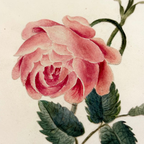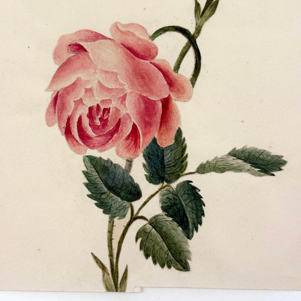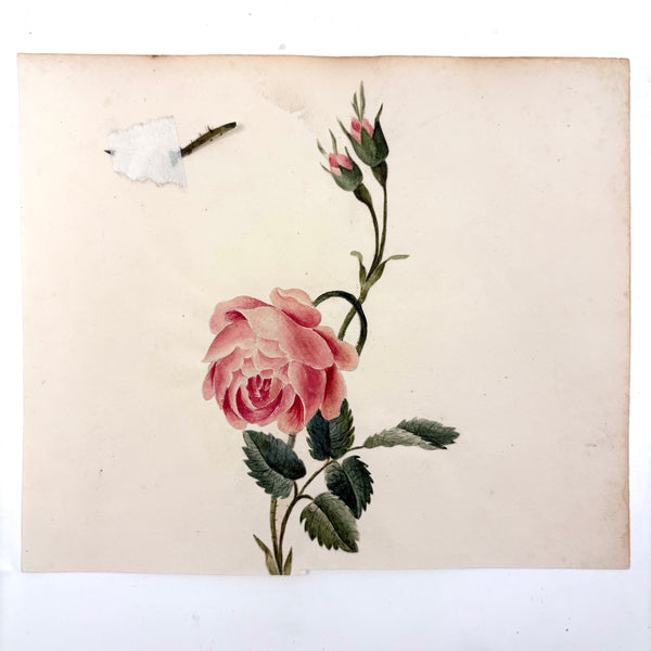 I am a bit obsessed with this one. It is a fine, c. mid 19th century watercolor of a rose, which was very precisely cutout and pasted down onto this piece of card (by it's original maker I believe). But in that cutting process, I presume, the paper stem of the watercolor rose tore, and so they pasted it down above. And so, the presence of that broken stem, which casts just a bit of a shadow onto the page, tells us not just that the rose itself was cut out and pasted down (hard to discern otherwise, though one can feel it with one's fingers), but also, to my mind at least, makes it feel like a very post-modern thing-- a deconstruction of illusionistic representation itself! Anyway, that's how I see it, self-reflexive, and also iconic feeling, and also all about delicacy and fragility. Love.