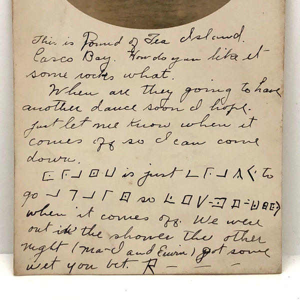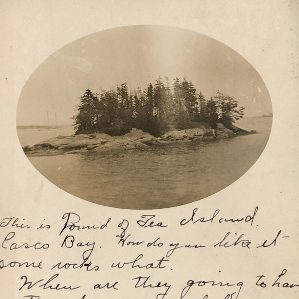 I just looked up Pound of Tea Island--one quarter an acre, now with one house on it, and described by the realtor who sold it in 2018 as one of the most iconic and coveted private islands along the Southern Maine coast. I love how the writer of this early 20th c postcard describes it: "how do you like it..some rocks, what." Of much greater interest is news of the next dance, and then a coded message relating to what will happen "when it comes off." Finally, news of having been "out in the shower" (caught in the rain I assume) the other night...[we] "got some wet you bet."