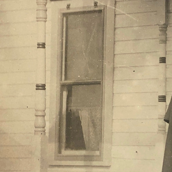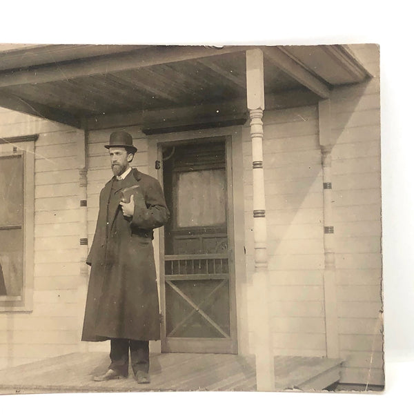 I'm assuming this man is a preacher, and that it is a bible held tightly in his grip, but I don't know for certain; I suppose he could be a door to door salesman! In any event, he certainly looks like a man on a mission, and to me the look on his face suggests he is contemplating his next move. I really love how he is framed by the four painted posts on the porch, with door and window behind, and also how the step down is cropped just out of the image such that he seems ready to step right toward us!