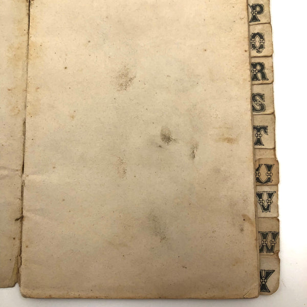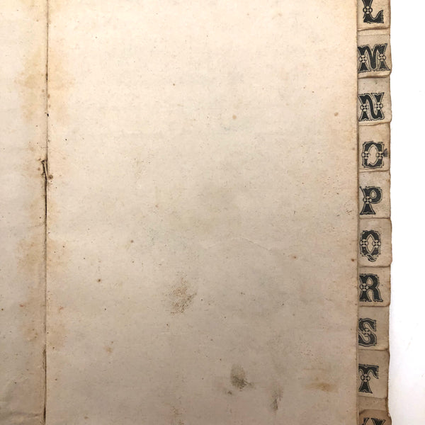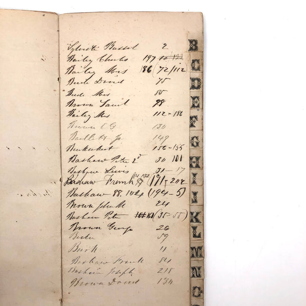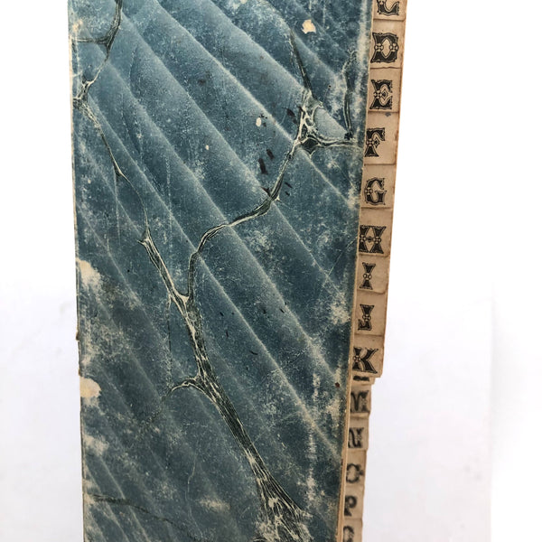 I just love these tall and narrow 19th c. alphabetical ledger indexes, which served as guides to much larger account ledgers. And the blue hand-marbled cover on this one is especially lovely. With stamped letters on the tabs in black ink, in an unusual font. Not surprisingly, the "Q" page is blank, with other pages ranging from nearly empty to nearly full.