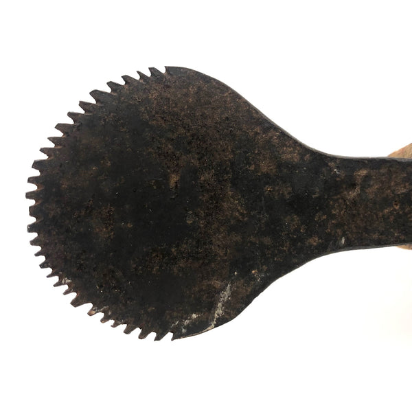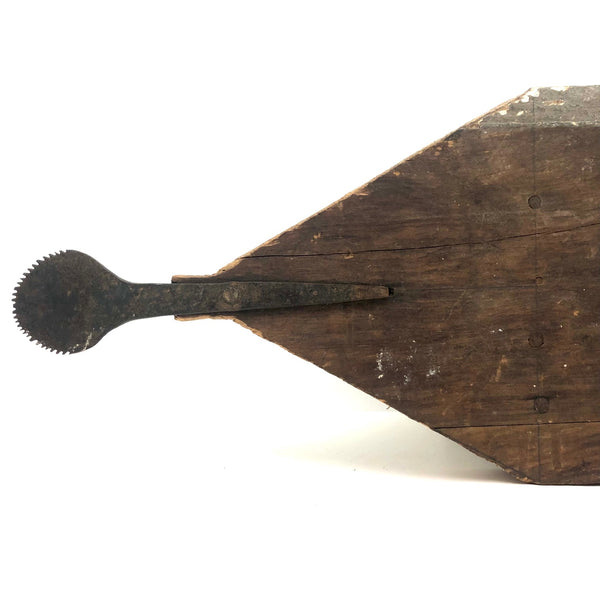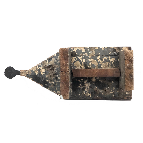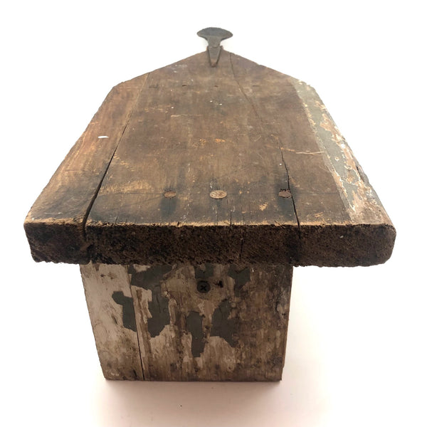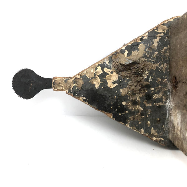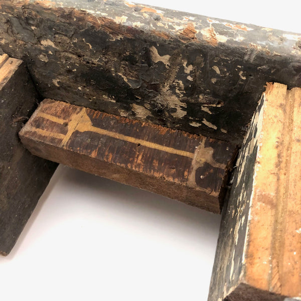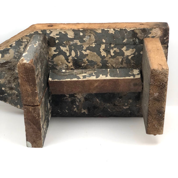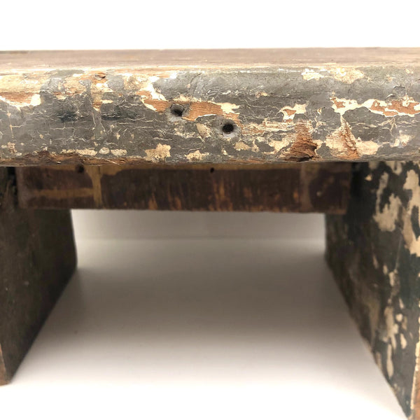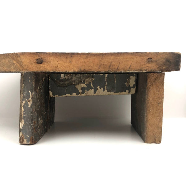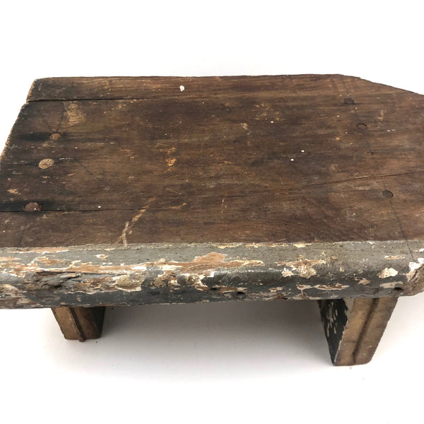 This one is a bit of a mystery to me, which is part of why I like it. I'd think that the iron "handle" at one end--with serrated edge around its flat, nearly round end--served a specific purpose....perhaps allowing a small vise or clamp of some sort to attach to it in order to do some sort of work? Or, maybe it was just a make do solution to making the stool easier to move from one place to another? I don't know (through would love to know, if you do!)--but I really like it, with its dry wood front punctuated with old fat nails, and one edge and the underside showing old chippy layers of white then grey paint. I'd probably use it as a sculptural pedestal for other things, but it seems to me it could also be turned around and used as a very primitive shelf!