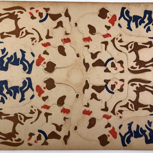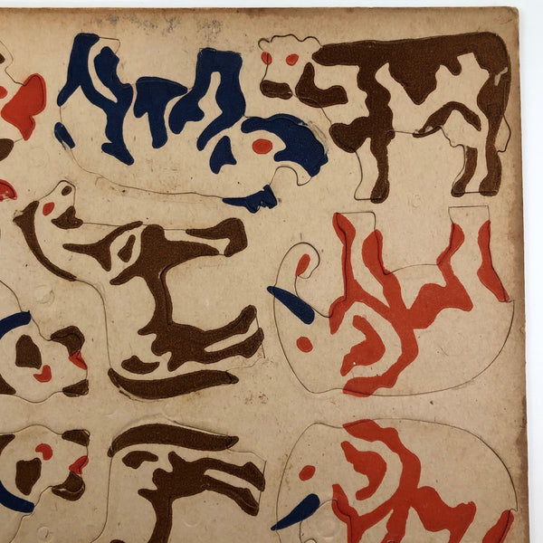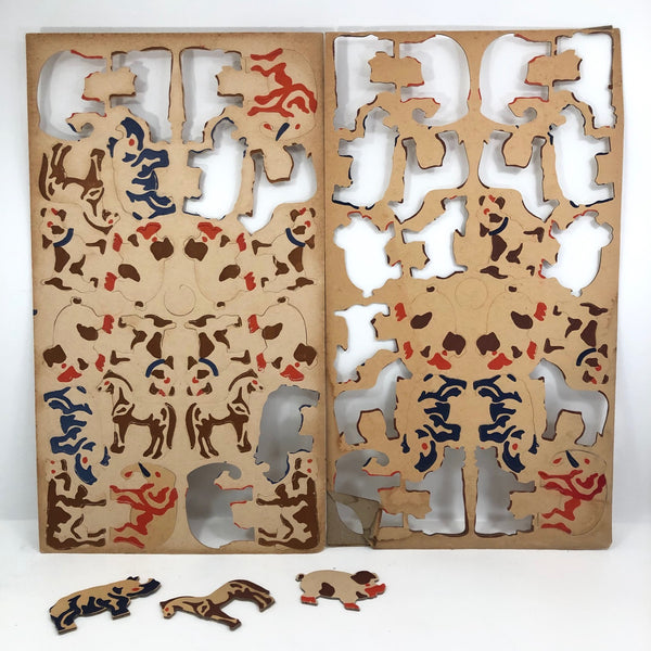 Very good, clean condition. Sold as a set. Some aging to the cardboard is visible mostly around the ages of the sheets, but I think this just adds to their charm. Each sheet measures 16 1/2" l x 8 3/4" w x 1/16" thick. Animals are about 2 3/4" long give or take. Included are two complete sheets and two partial, as pictured.
