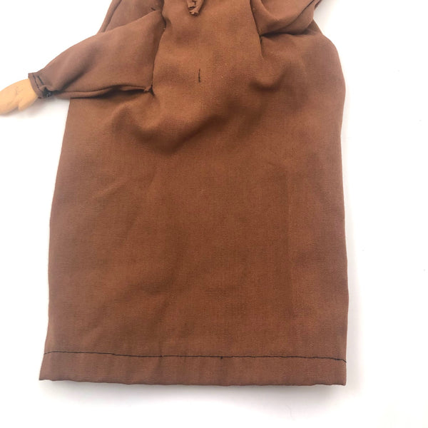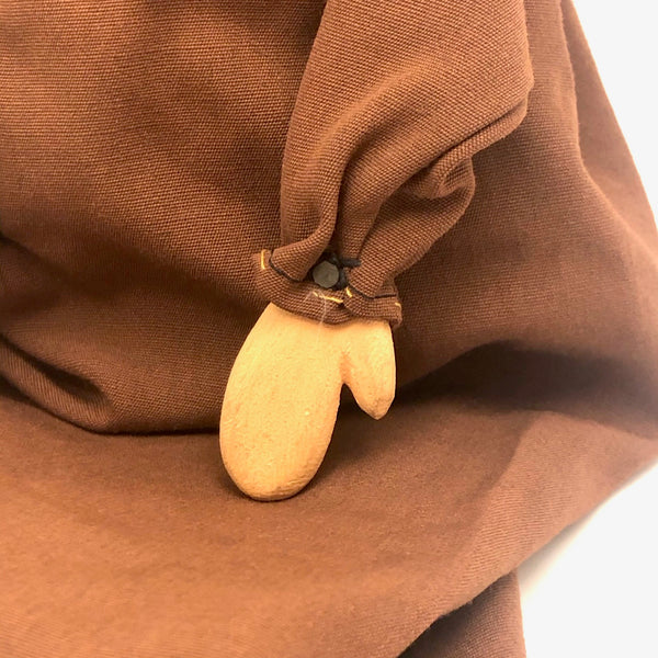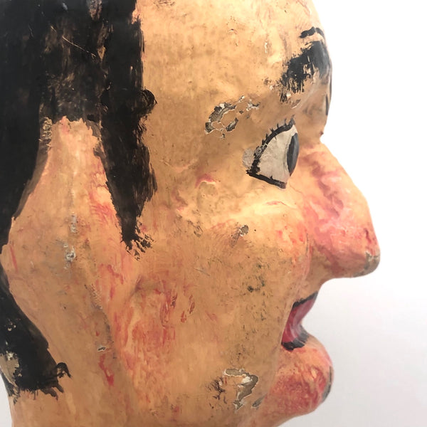 Handmade and hand-painted papier mache head and hand-sewn costume, with little wooden hands nailed to the end of the sleeves. 15 3/4" tall; head measures approx 4 3/4" t x 3 3/4" w x 4" d.  Well played, with some chips to the paint and knocks to the chin for sure, all to the good I think.