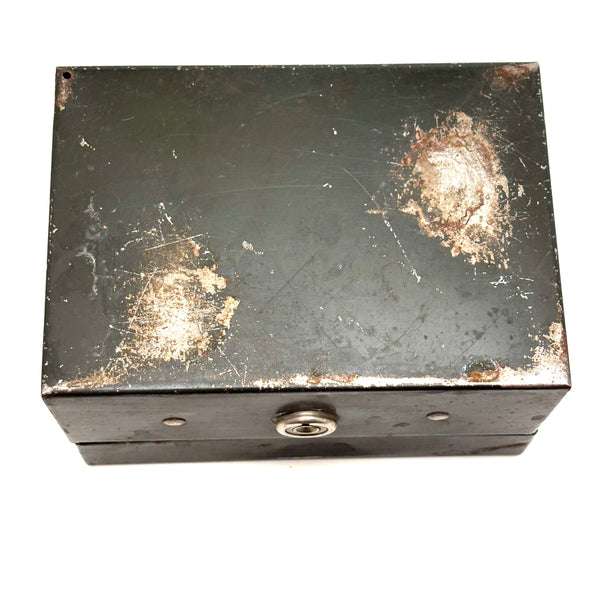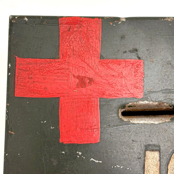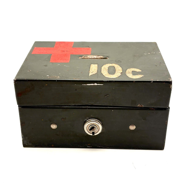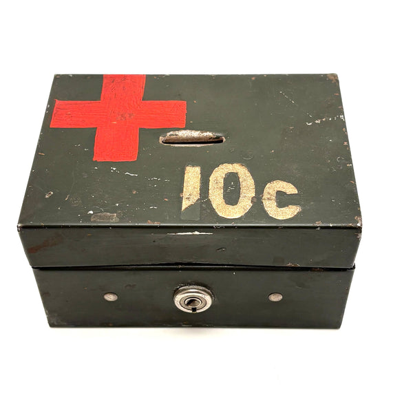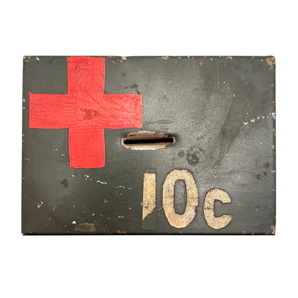 Found in Vermont, I presume this "make do" donation box is WW2 period, when dime collecting for the war effort was at its height. Many good things rolled into one here, that bold red painted Red Cross high among them! The 10 c was done with white tape, medical tape I might guess. Adaptations born of necessity, turning a small metal lock box into a donation collection bank, which feels both very of its time and also very timely.