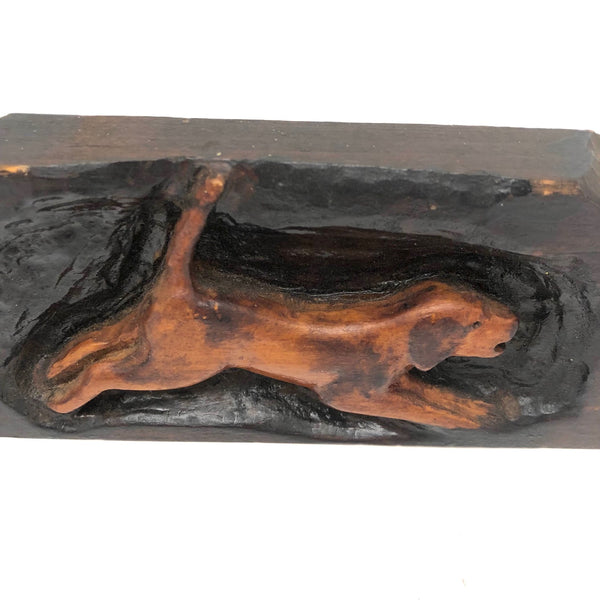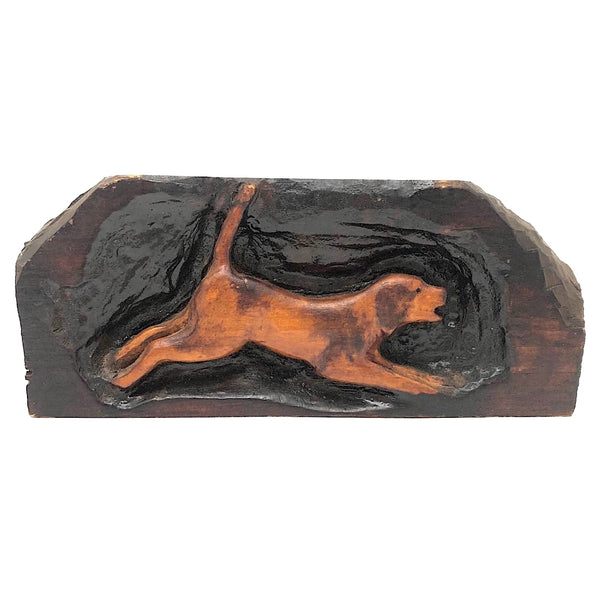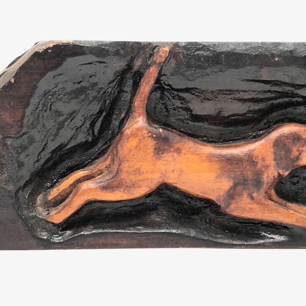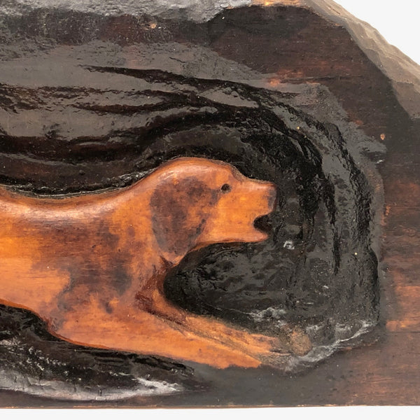 One of a bunch of smallish animals of various sorts gathered at Brimfield, this one I really like for the energetic puppy-ness of the carved spotted dog, suspended forever mid-leap, mouth open and tail high. Carved in deep relief, stained and varnished, 1940s-50s or so, I would guess.