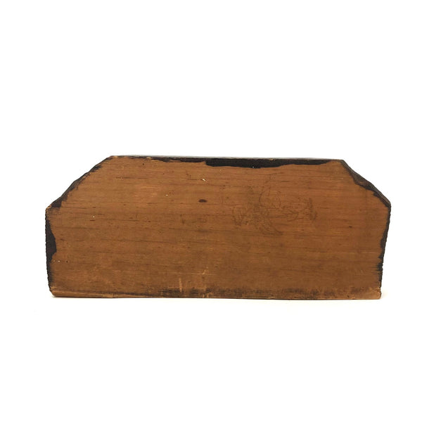 6 1/4 l x 2 5/8 t x 3/4" d. Very good condition. Stands up on its own, but a hook easily added for hanging.