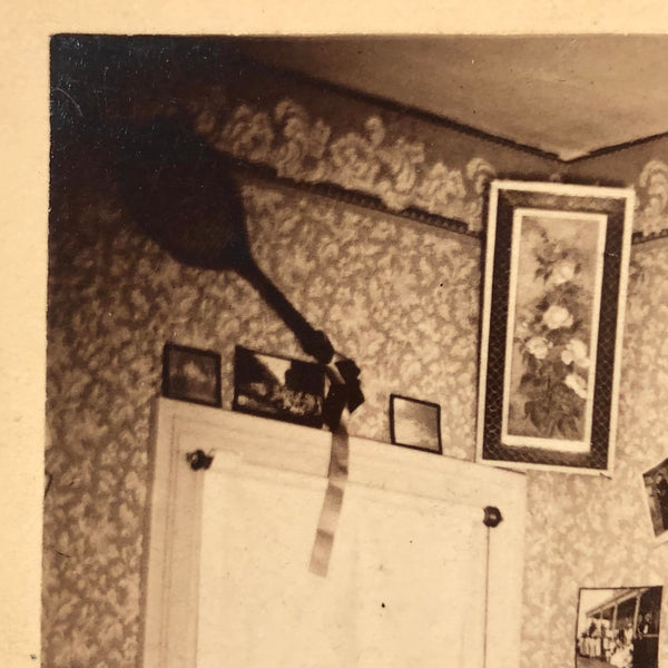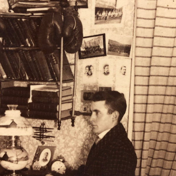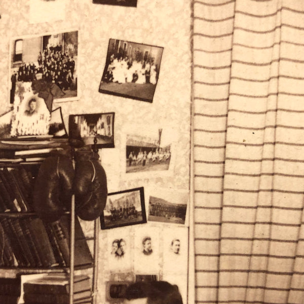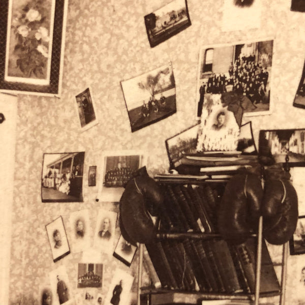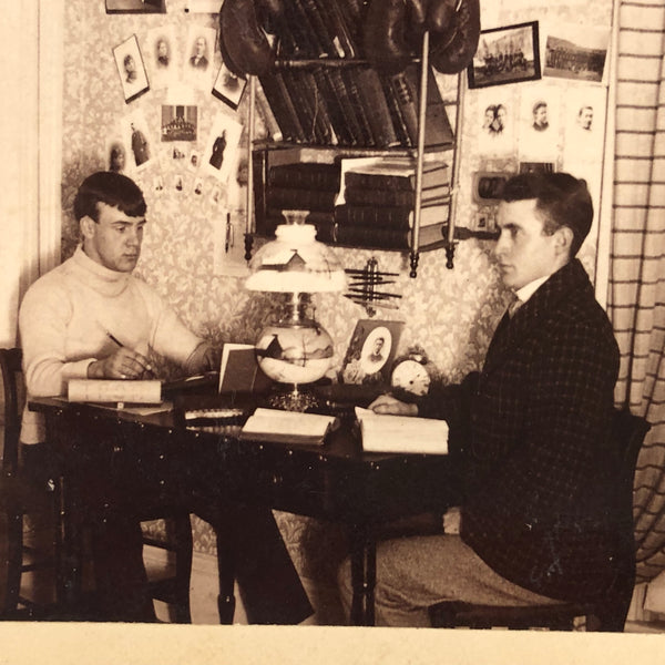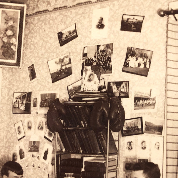 I just love these two, and the period in their young lives this photo caotures--students in college, or very recent graduates, working hard to be taken seriously and to start making their ways! Lots of information packed into the image, with a slew of cabinet cards and group photos mounted the wall just above their shared desk--I'd like to think each of them allotted one half of that wall, with each young man's mother, father, and siblings hovering right over their heads! (Reminders to walk the virtuous path!) And each with a pair of boxing gloves hanging there too. Portraits upon portraits adding up to quite a portrait.