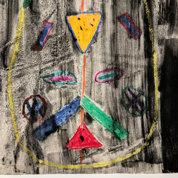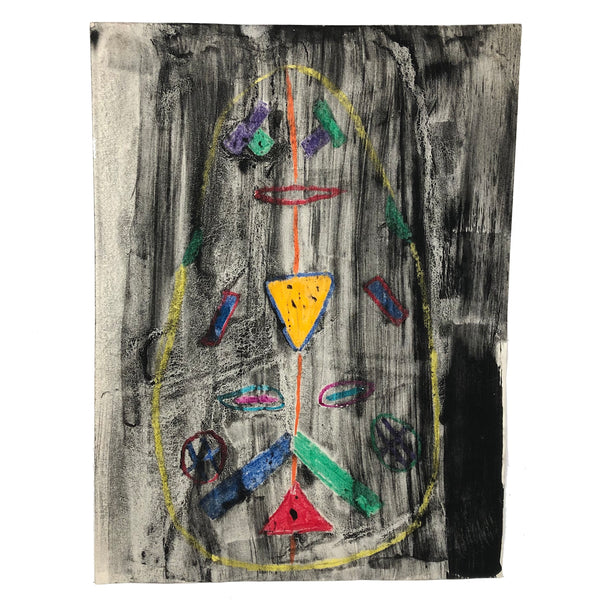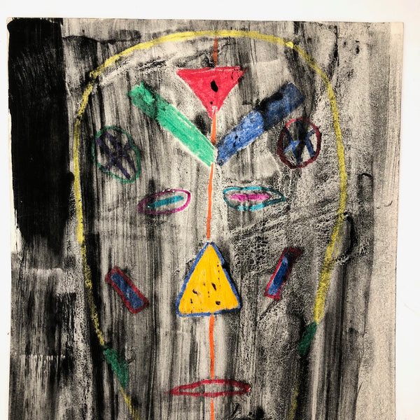 I actually picked this one out of a pile looking at it upside-down, thinking it looked like a smiling ghost (or snow woman)--see second photo. Then I turned it the right way up to find this very sober looking, somewhat Frankenstein-ian face! Both ways pretty terrific I think, and I like this idea of the drawing holding two aspects at once. Plus what a brilliant thing crayon resist drawing/paintings are, with the scraped away black tempera paint lending extra moodiness and aura to the whole thing. Great.