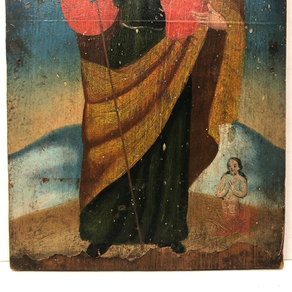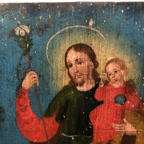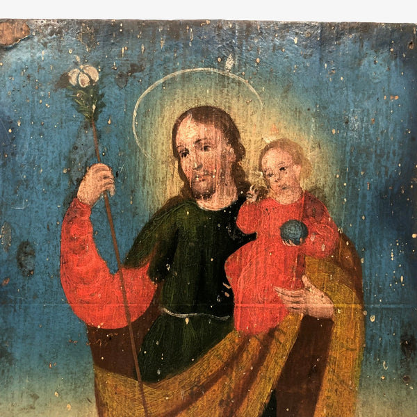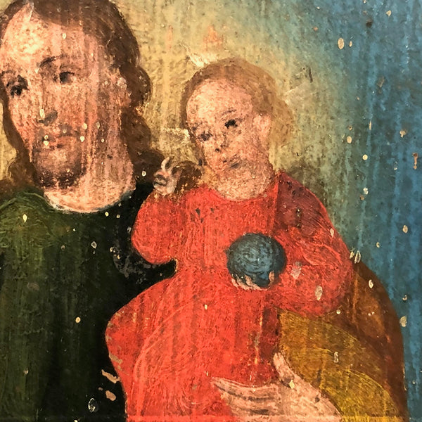 Saint Joseph witj baby Jesus was a common subject of santos paintings, with the child often holding a globe, as here, and Joseph with a lily blooming staff. More uncommon though, and what makes me especially love this one, is the inclusion of an Anima Sola, or "lonely soul" suffering in Purgatory, depicted here at lower right, licked by flames--and perhaps the raison d'etre for the painting, appealing for salvation. Oil on wood panel, with very rich blues and red and ochres and a great patina.