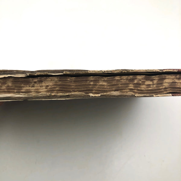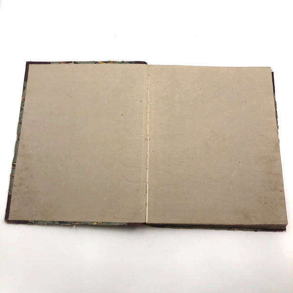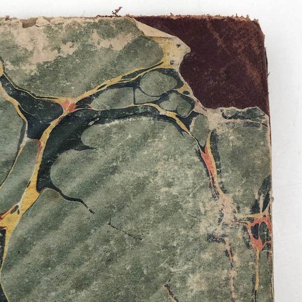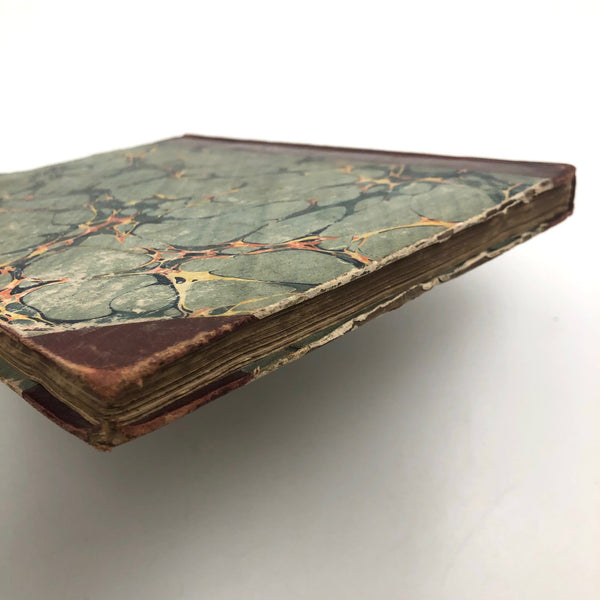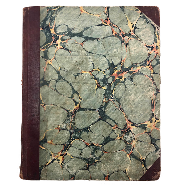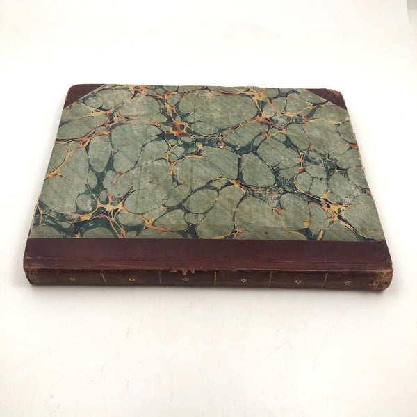 9 7/8" x 7 3/4" x 11/16. Hardback with leather spine and corners, and hand-marbled paper cover. Some wear to the cover, edges and corners, but overall very good condition. Some text is fairly light but all readable, and headers and diagrams are dark and clear.