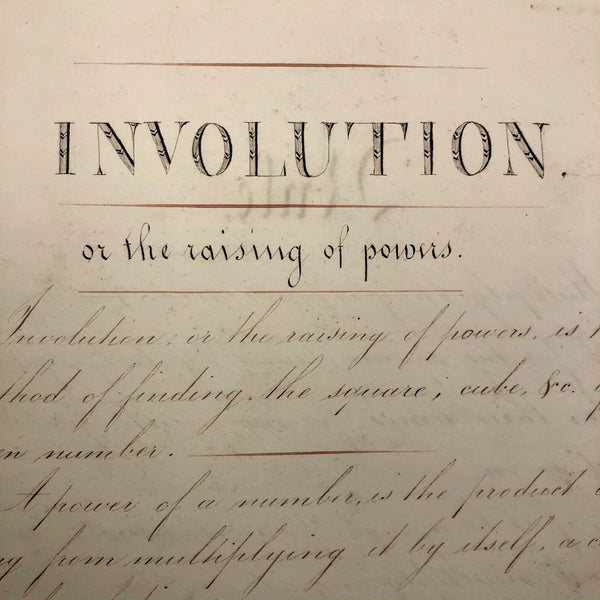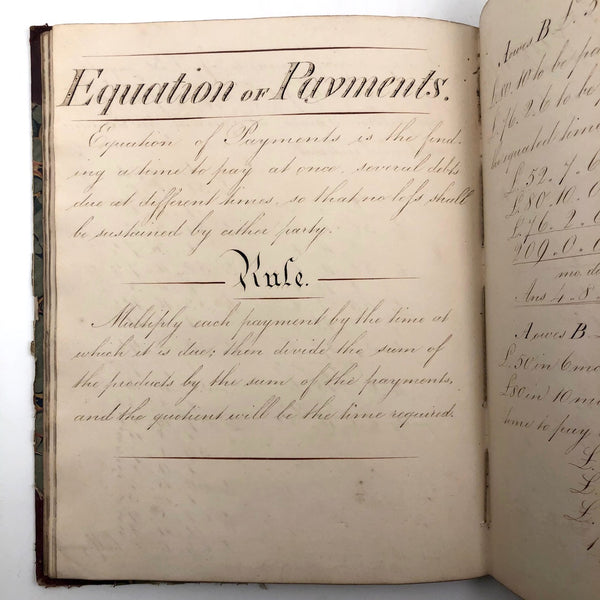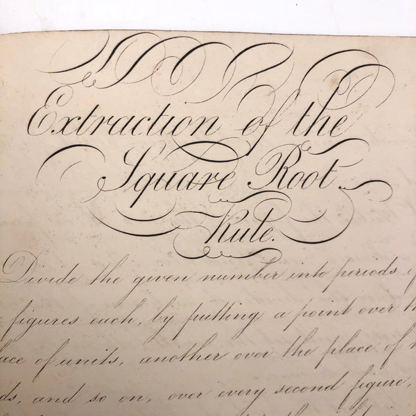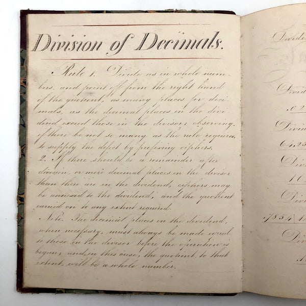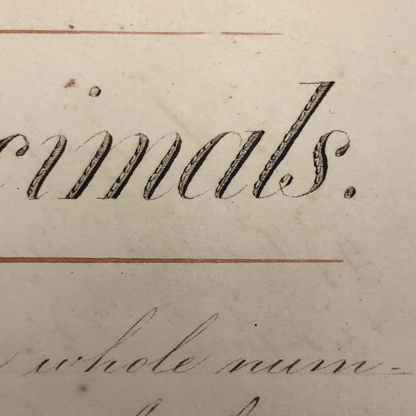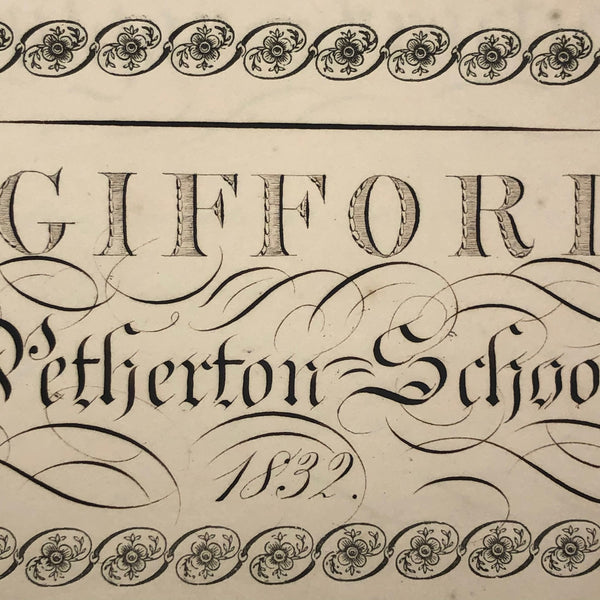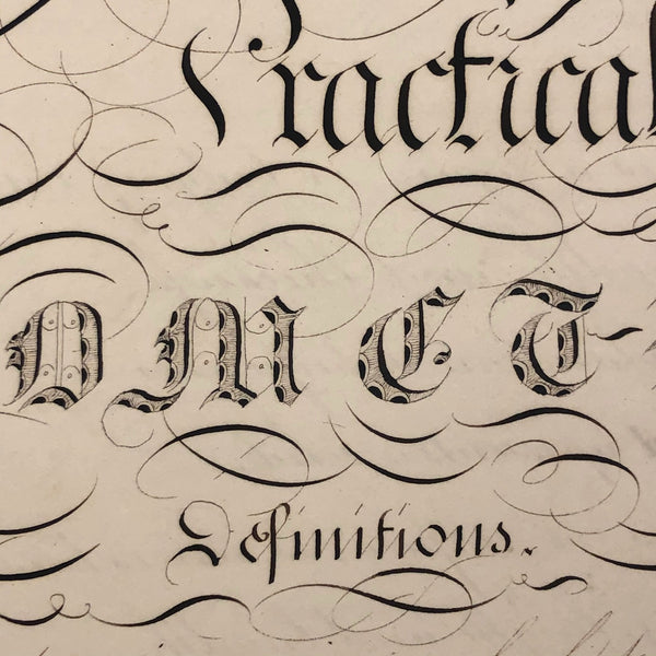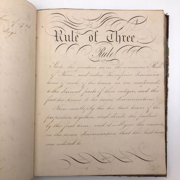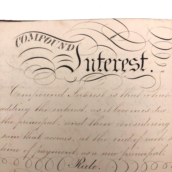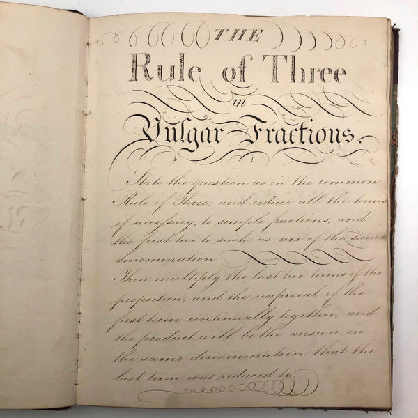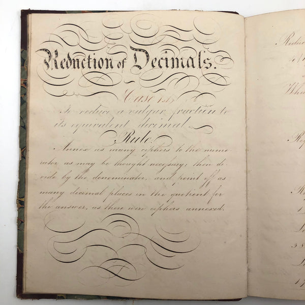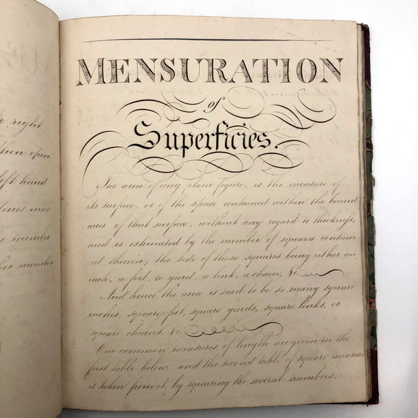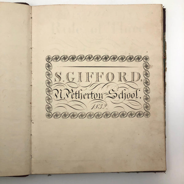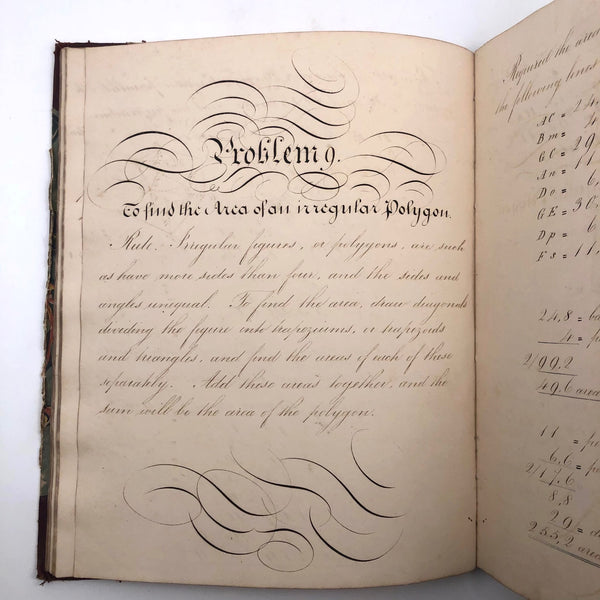 This is the mother of them, Samuel Gifford's from 1832, with some 90 pages completely filled on front and back. It features beautiful Spencerian + Fraktur headers throughout plus tons of geometric diagrams carefully drawn with compass and ruler, including a few enhanced with watercolor, and some use of red and blue ink in addition to black (which reads now as sepia) The book starts in one direction then was flipped midway and started in the other direction, I assume corresponding to two semesters. Pictures tell the story best.