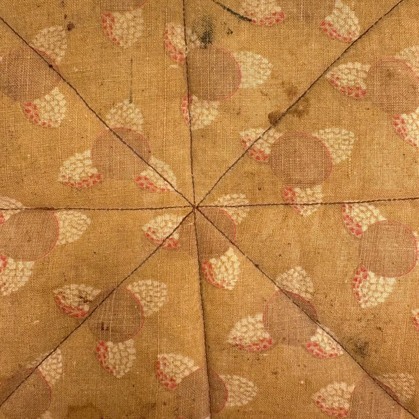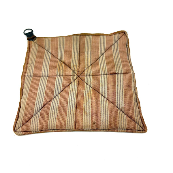 A nice old one, with a terrific combination of fabrics, honey brown calico on one side and red, white and blue ticking stripes on the other. Plus a nice old tin hook sewn to the corner. A good and satisfying thing.