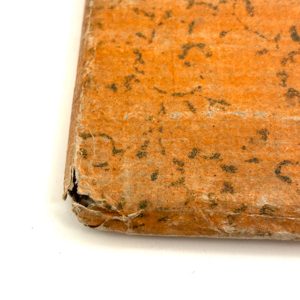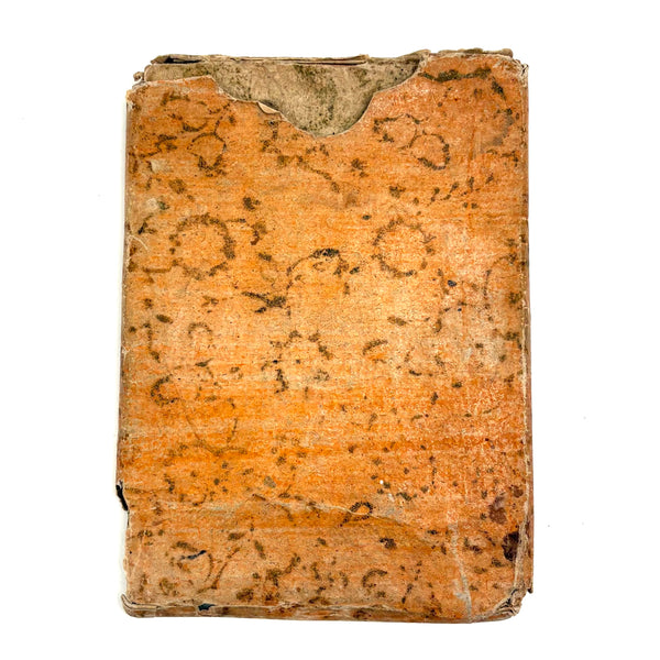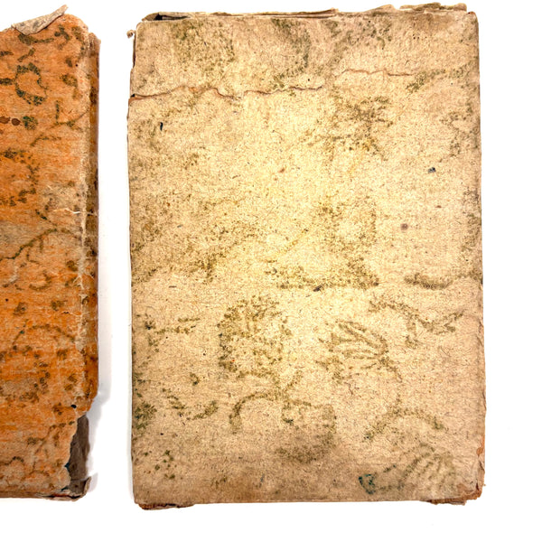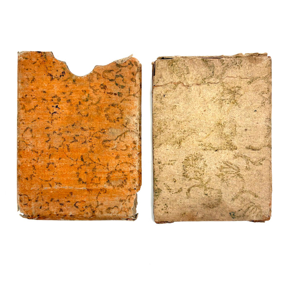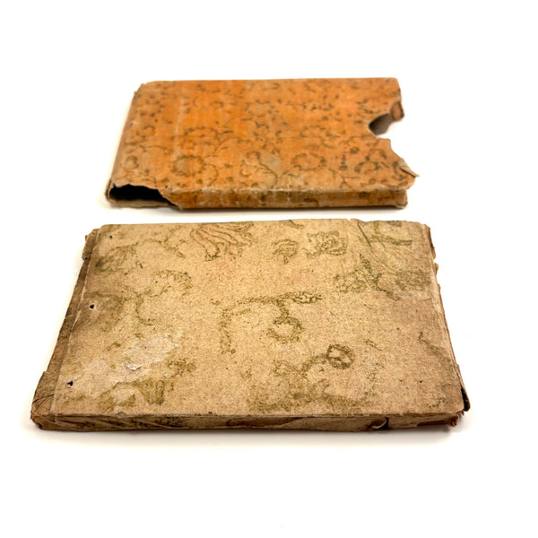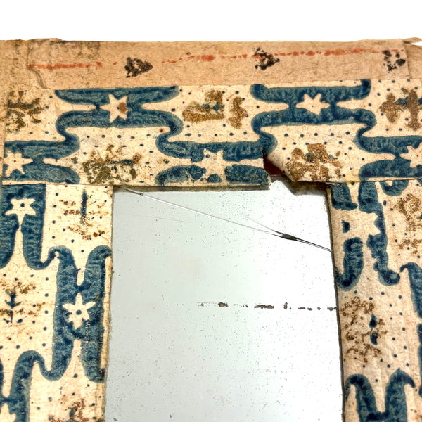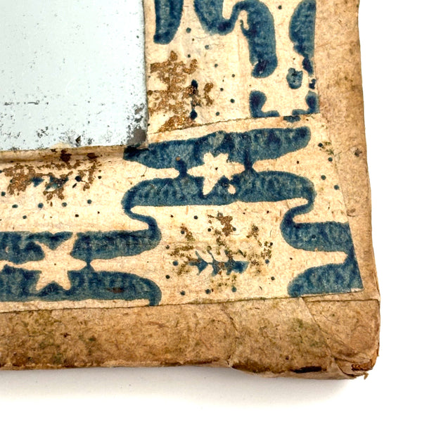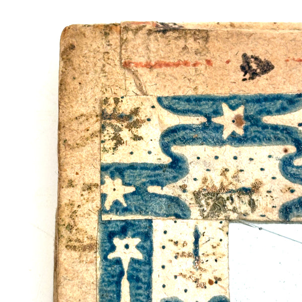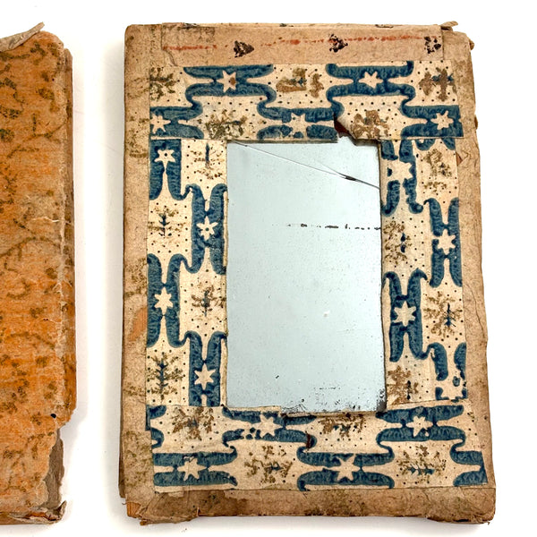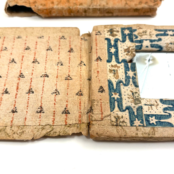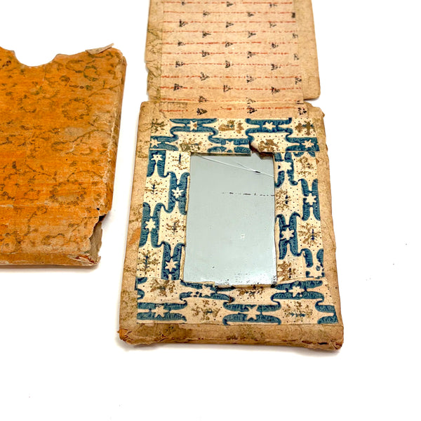 I love everything I buy and sell in one way or another, but then there are the things I feel a special reverence for, handling as if precious jewels, and this is one of those.It is a travel mirror, American I do believe, c. 1830s-40s, framed in the most beautiful block printed paper (look closely and there is a gold leafed pattern printed on top of that best blue one), with hinged cover (in more beautiful block printed paper, over board) that folds over protect it, and allows it to be stood up when opened. Plus, amazingly, the original sleeve into which it slides smoothly and fits very snugly. As someone who will forever buy a book from this period for a beautiful block printed cover or endpapers, and who forever covets a diminutive band box covered in paper of this ilk, this is really a dream. And of course I love the thought that it carries nearly 200 years of reflections along with it. A rare and wonderful survivor; I don't think I'll ever find another like this.