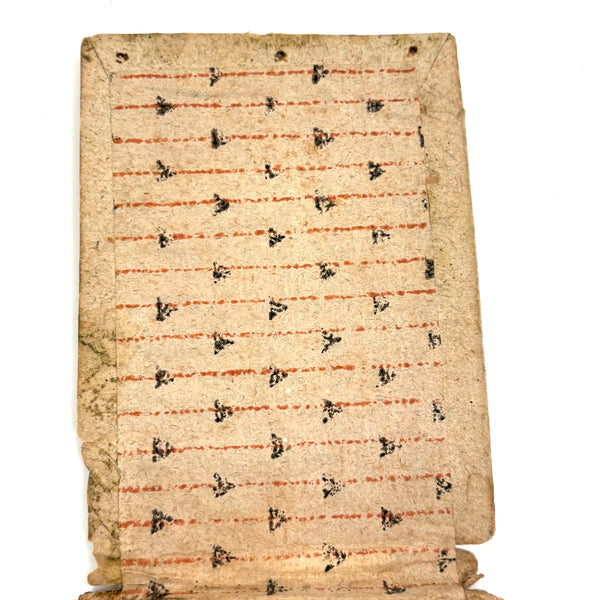 Sleeve, into which the mirror fits snugly when closed, 5 1/4" x 3 3/4" x 3/8". Beautiful antique condition, general light wear. Flaws in the mirror inherent to its original pouring. One lower corner of the sleeve shows a hole that could well be product of a mouse nibbling at it; the other corner shows a smaller tear, just from wear. Stable and sound and really not fragile, though one wants to be gentle slipping it in and out of the sleeve.