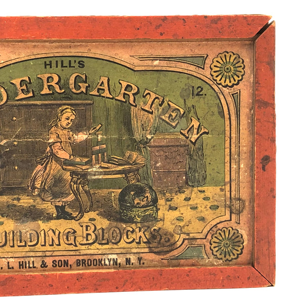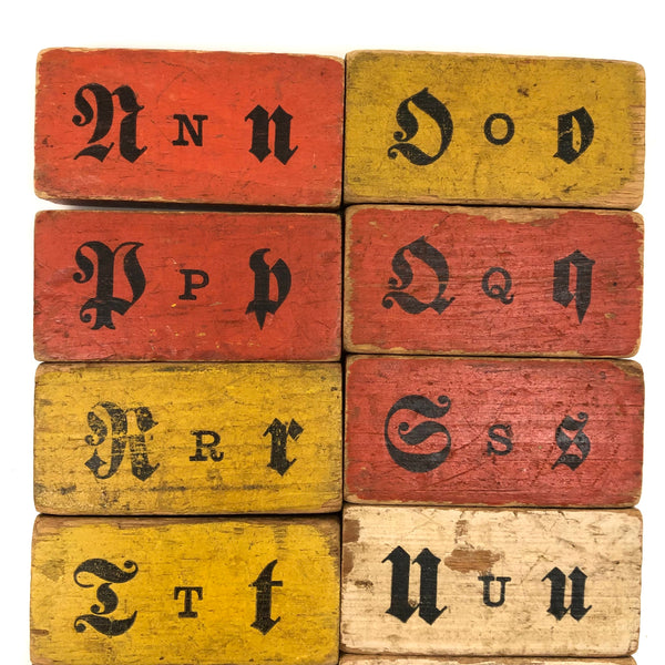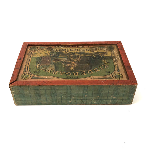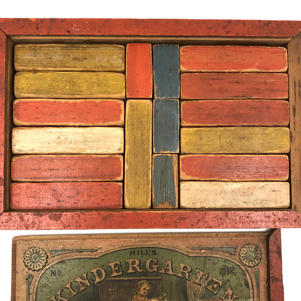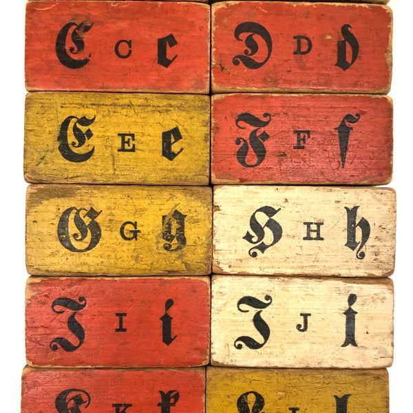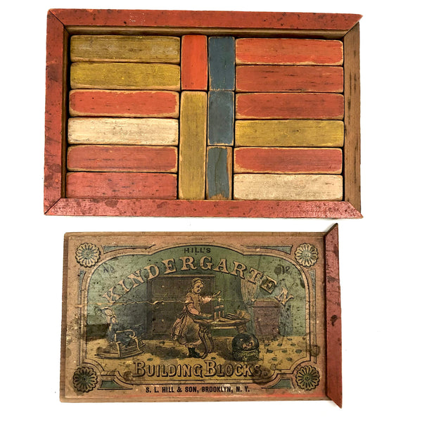 Gorgeous, and useful too. This is a scarce, early (c. 1860s), complete set of Hill's Alphabet blocks--especially rare for showing three iterations of each letter on the face of each block: upper and lower case cursive plus upper case block letter in between. (And I will admit that I--as if a child of five or six myself--have found them useful this week as reference tools in helping me decipher some 19th c. handwriting!) This is a complete set, A through M on one side, and flip them over for N through Z (in order, i.e. the A turns over to be N, the B turns to O, etc. ) Plus a few little extra blank ones in blue and red, made as plugs to fill the box, original to the set. Fantastic color, softened and worn just right, in their smart looking original with plaid pattern paper sides, all in very good condition. (These are precious sets and tend to be quite preciously priced!)