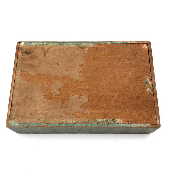 Box measures 7 1/8" x 4 5/8" x 1 3/4". Complete and in lovely used antique condition. Slide lid on boxes fits snugly and closes tight. Partial clean/minor split to lid underneath label, holding together just fine.
