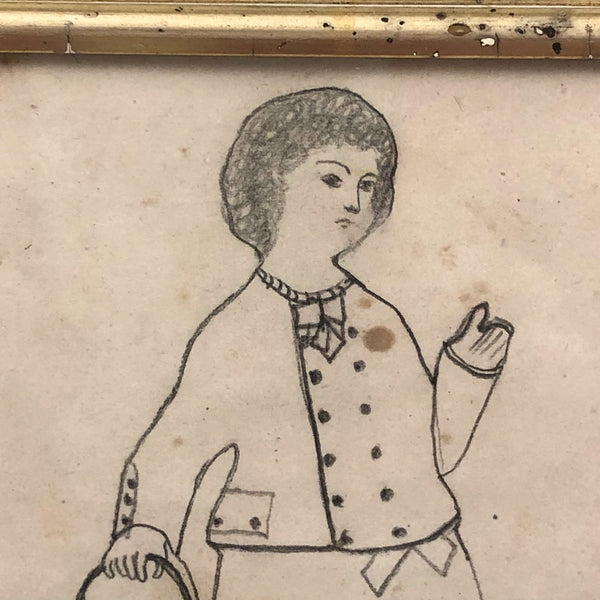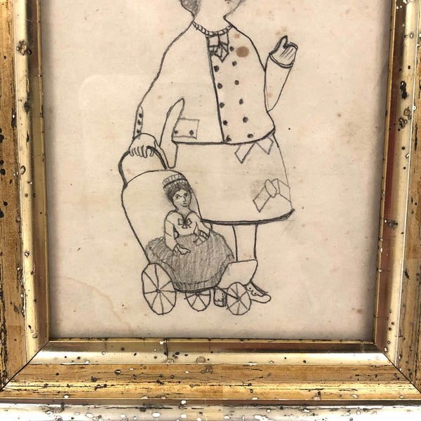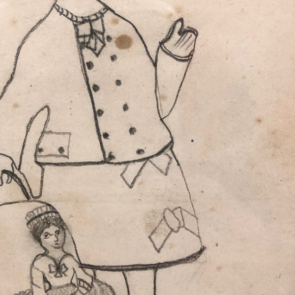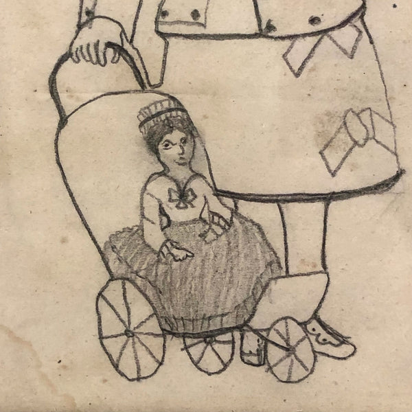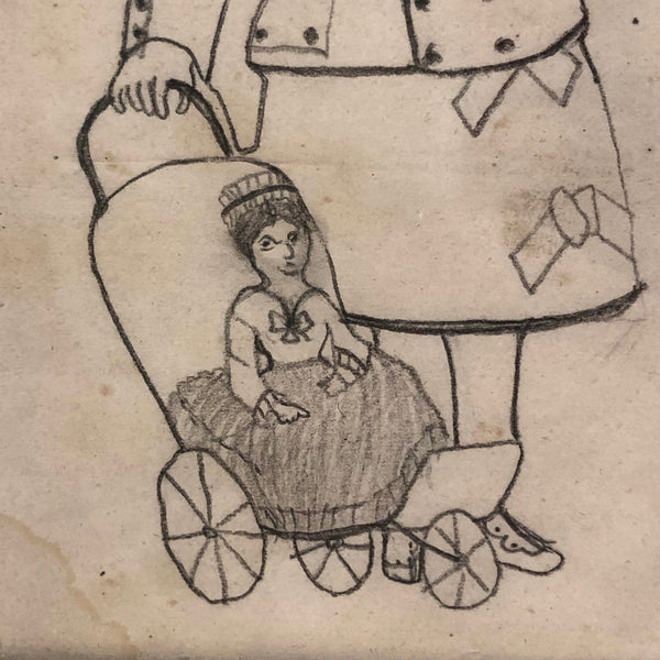 There is something so heartening to me about strongly identifying with the subjects of drawings and paintings and objects made many years ago--as much as things have changed, we're still human! This girl, pushing her baby doll along side her, reminds me so much of myself dressing up and pretending to be a lady when I was a girl that she makes me laugh, especially with head cocked and one finger raised as if about to issue a command. Plus this wonderfully specific depiction of the doll in three wheeled stroller--clearly the prized doll. School girl drawings like this give me no end of joy.