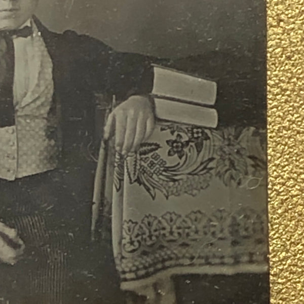 I immediately fell in love with the seriousness of expression on this young man's face, which I read not as discontentment, but rather as great focus and ambition; really he looks to me as if preparing to rule the world! I am guessing the two books at right are most likely the bible printed in two volumes, so perhaps it is the fear of god rather than ambition that drives him and makes him look so sober! Whatever the case, perhaps the perfect gift for the child who would rather read than run around the playground, or for a serious sort of any age.