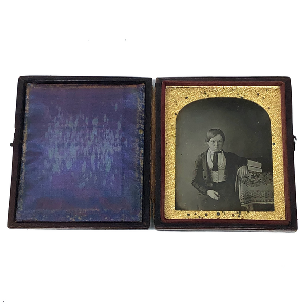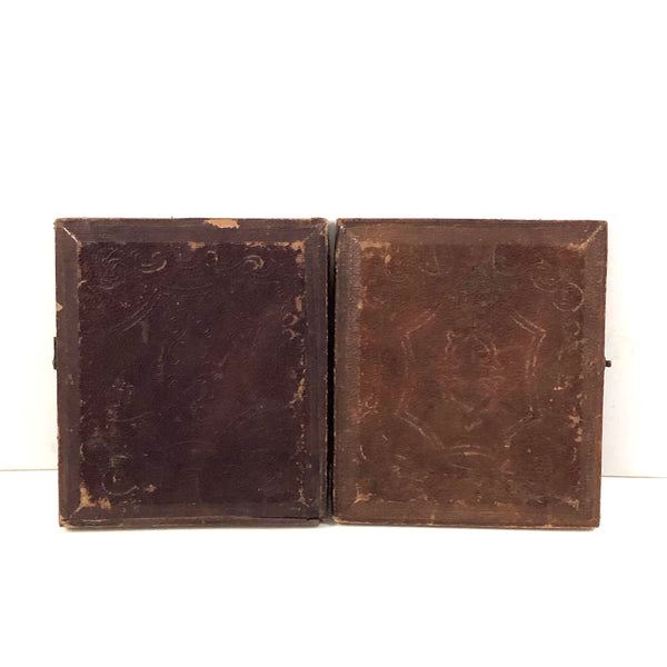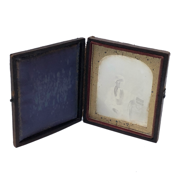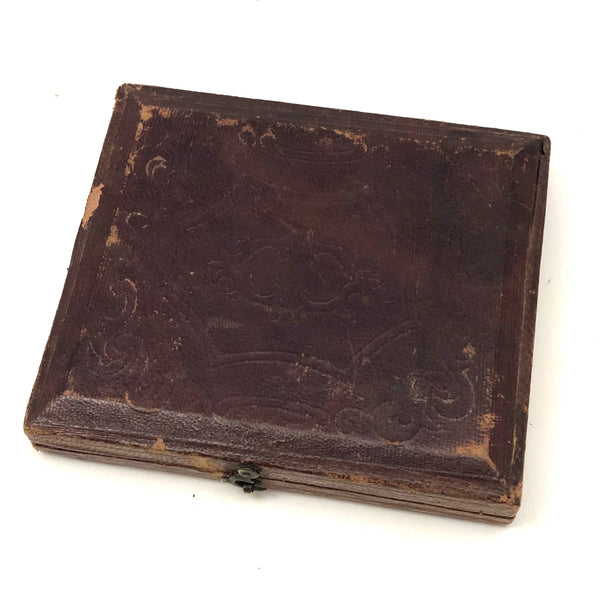 Cased: 3 11/16" x 3 1/4". Sixth plate, in leather case with clasp. A few light scratches to left and right of his face, overall good condition, crisp and clear, with general wear to the case as documented.