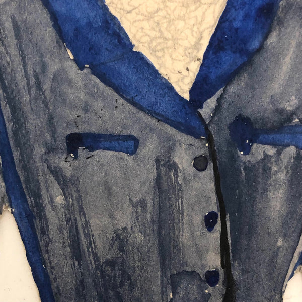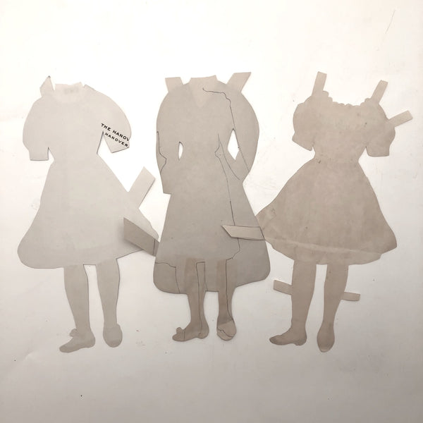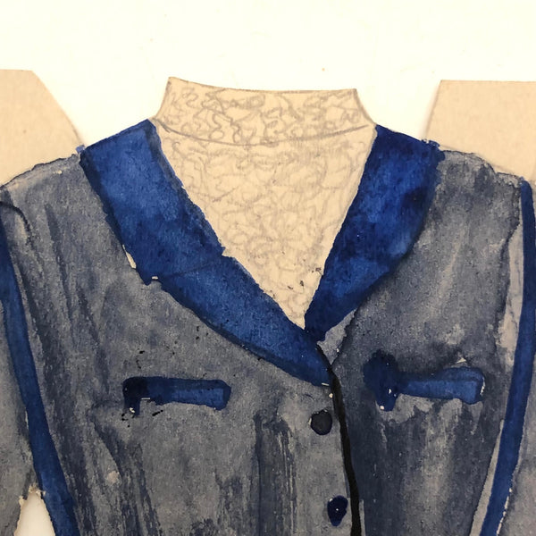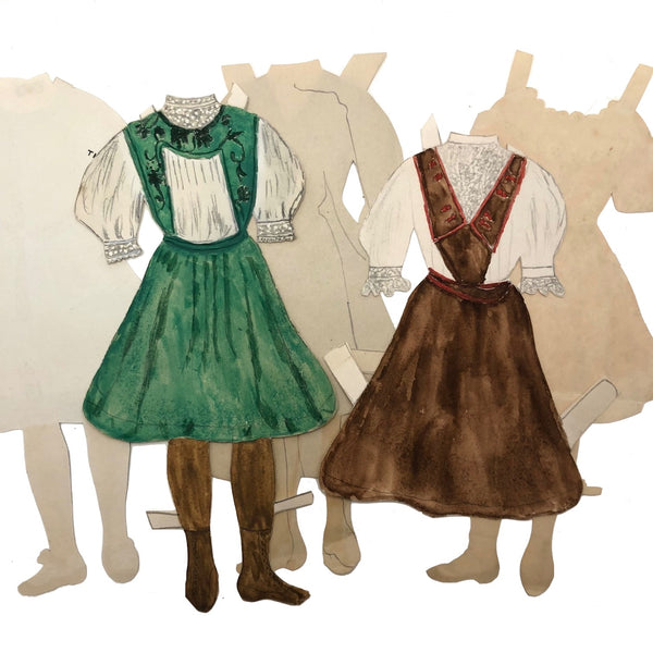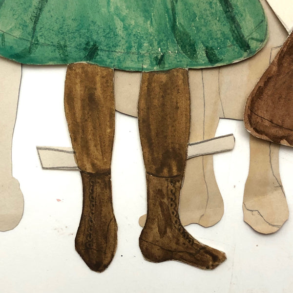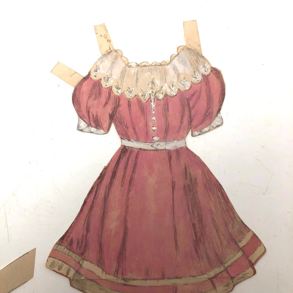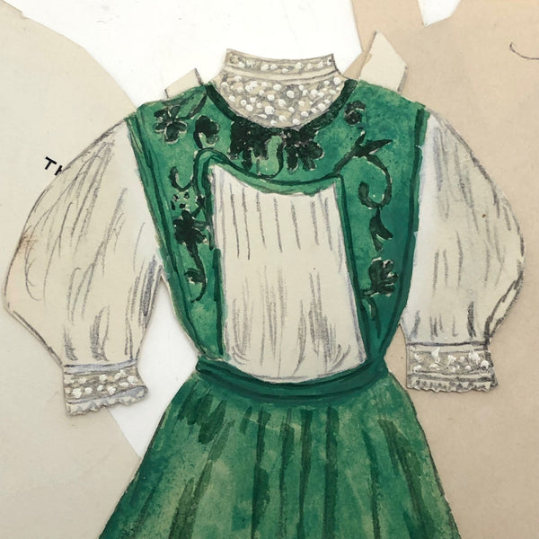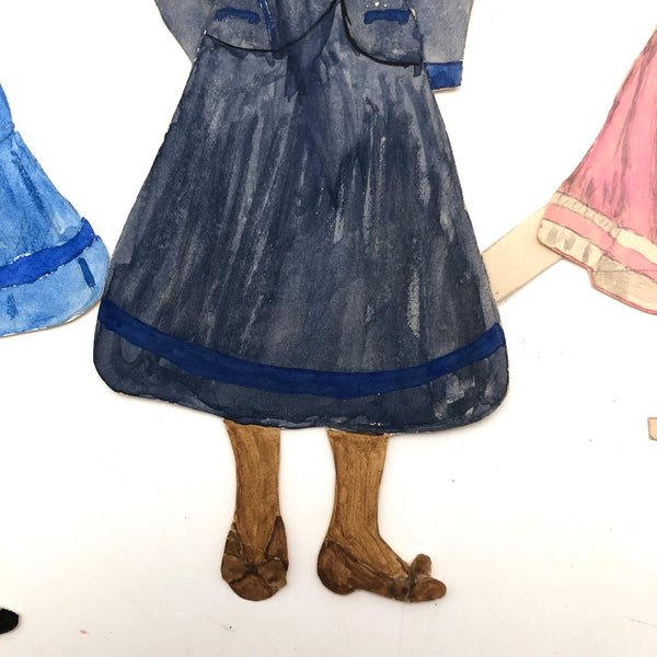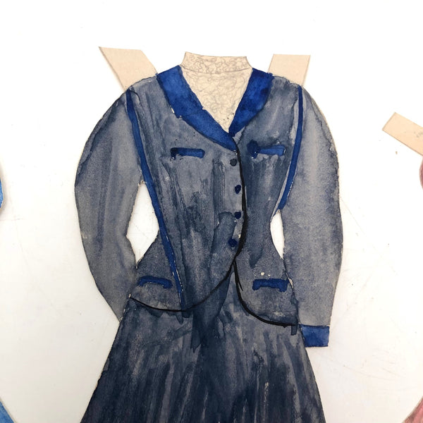 I played with paper dolls as a child, but just ones I cut out of a book, never handmade and carefully watercolored ones such as this, with pencil drawn lace and details, too, and which I might guess someone's mother lovingly made for them. I just can't not rescue things like this, which just need a cutout figure to put them into play again, or would be lovely together in a frame. Set includes five in total, as documented.