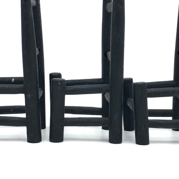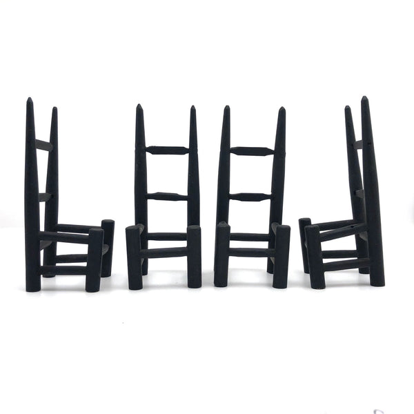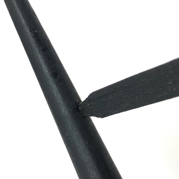 The last photo shows that there are actually five of these included in this set, and that they pair great with the grain-painted table listed separately, but for the sake of ease I'm showing four in most photos. I believe these were made in expectation of woven rope seats being added, which never happened. I love the spiky, a bit tramp art-esque look of them as is, but what a great project for a weaver or anyone to craft custom seats for them now--I might hope in vibrant colors that would really pop against the black!