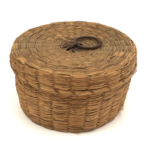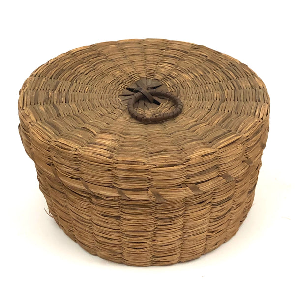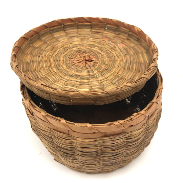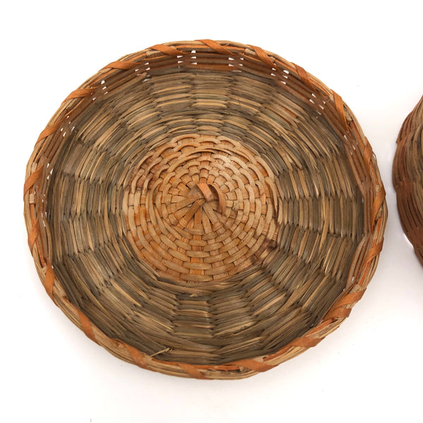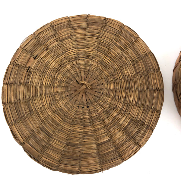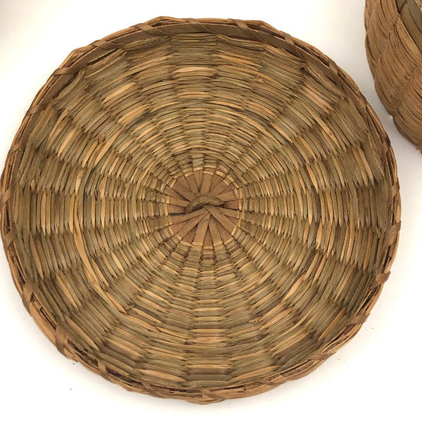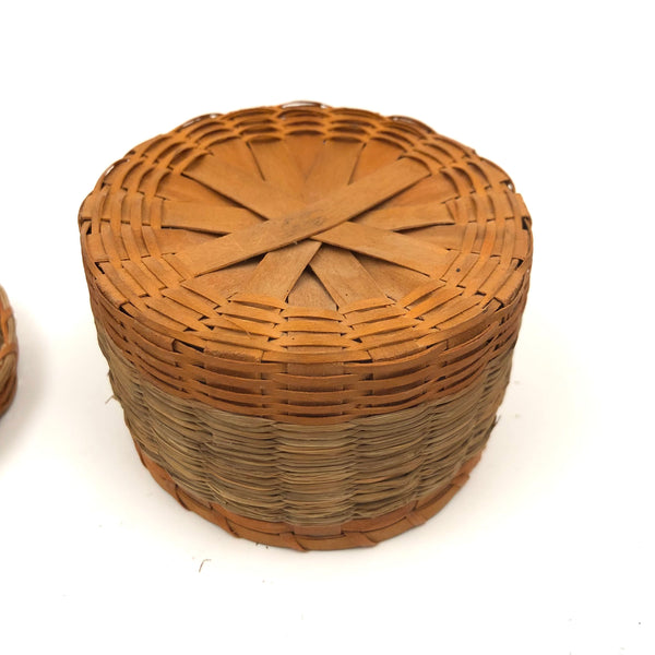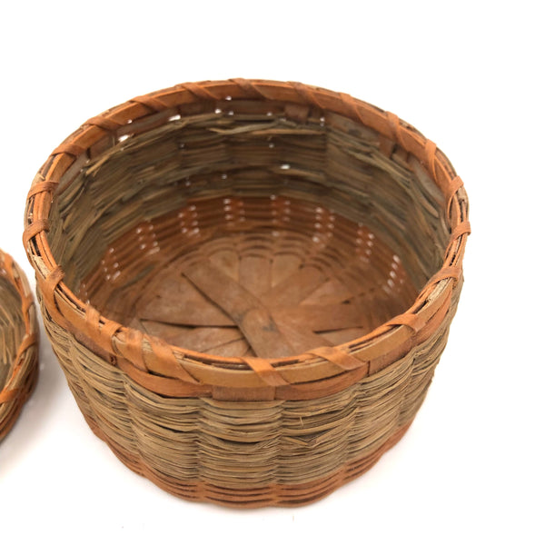 Sold as set of three. Smallest: 2” t x 3 1/4 d; middle 3 3/4” d x 2 1/8” ; large 2 5/8 t x 4 5/8” d. All in very good condition, structurally sound and sturdy, with lids fitting well. Just a bit of fraying to the grass in a couple of spots on the largest basket, minor and not detracting.